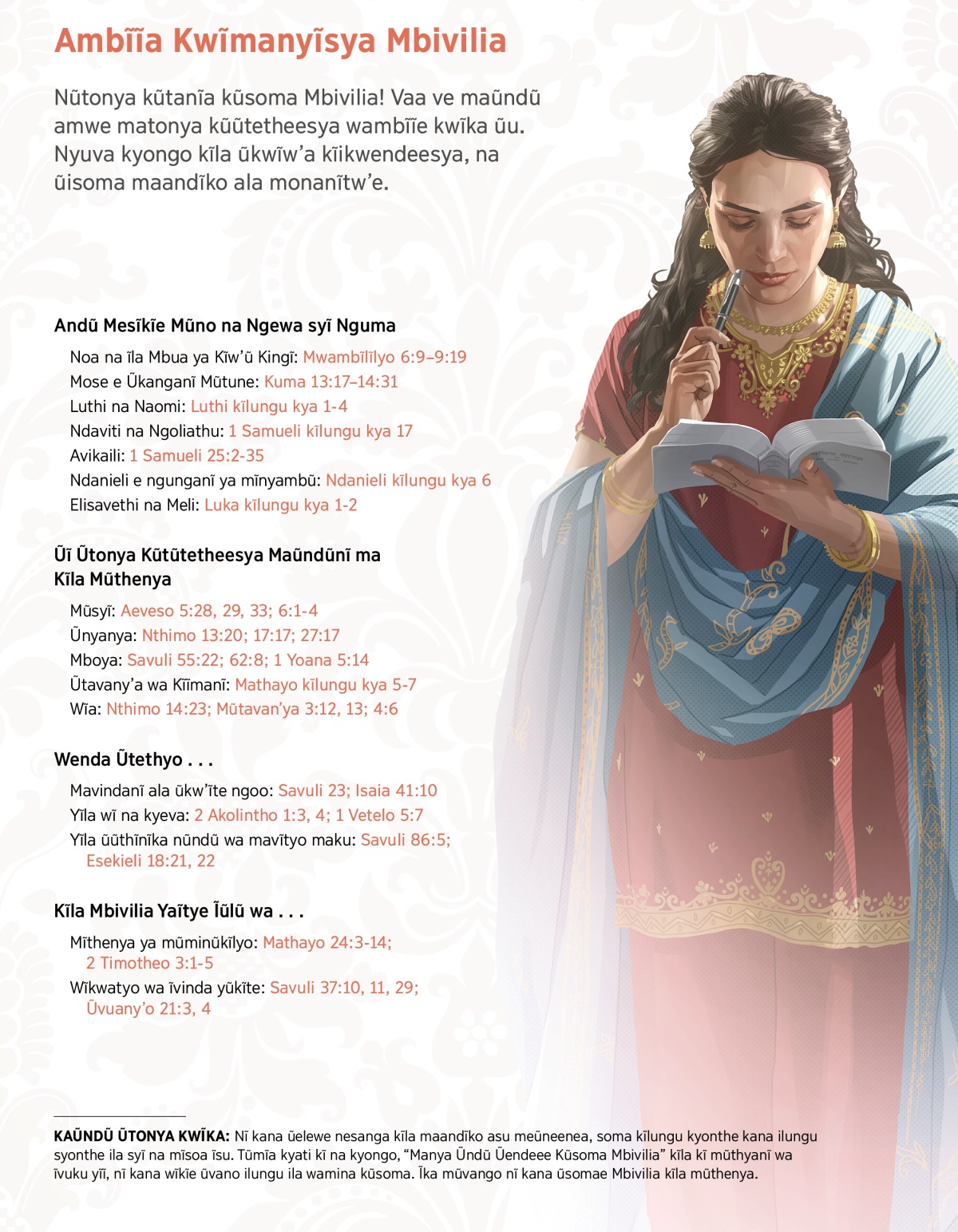 KAŨNDŨ ŨTONYA KWĨKA: Nĩ kana ũelewe nesanga kĩla maandĩko asu meũneenea, soma kĩlungu kyonthe kana ilungu syonthe ila syĩ na mĩsoa ĩsu. Tũmĩa kyati kĩ na kyongo, “Manya Ũndũ Ũendeee Kũsoma Mbivilia” kĩla kĩ mũthyanĩ wa ĩvuku yĩĩ, nĩ kana wĩkĩe ũvano ilungu ila wamina kũsoma. Ĩka mũvango nĩ kana ũsomae Mbivilia kĩla mũthenya.