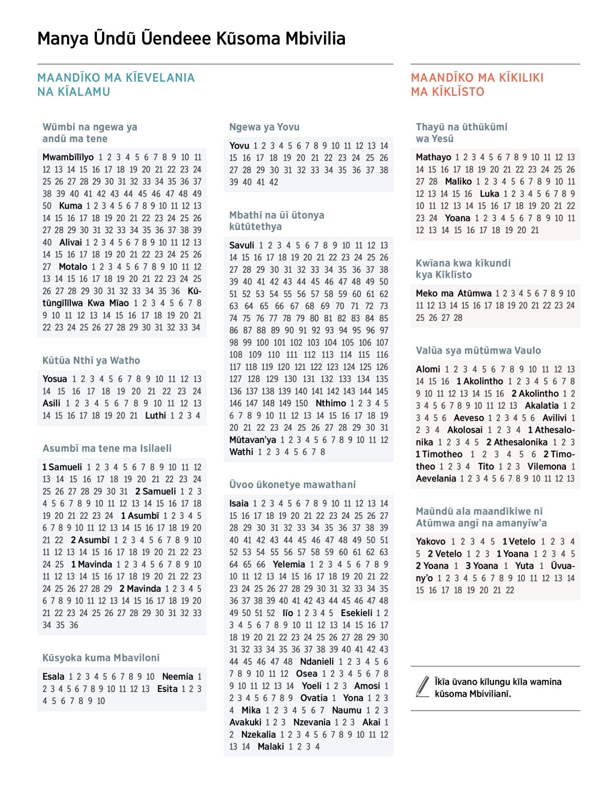 Manya Ũndũ Ũendeee Kũsoma Mbivilia Yĩla yĩ na Movano Wũmbi na ngewa ya andũ ma tene Kũtũa Nthĩ ya Watho Asumbĩ ma tene ma Isilaeli Kũsyoka kuma Mbaviloni Ngewa ya Yovu Mbathi na ũĩ ũtonya kũtũtethya Ũvoo ũkonetye mawathani Thayũ na ũthũkũmi wa Yesũ Kwĩana kwa kĩkundi kya Kĩklĩsto Valũa sya mũtũmwa Vaulo Maũndũ ala maandĩkiwe nĩ Atũmwa angĩ na amanyĩwʼa Ĩkĩa ũvano kĩlungu kĩla wamina kũsoma Mbivilianĩ. MAANDĨKO MA KĨEVELANIA NA KĨALAMU Wũmbi na ngewa ya andũ ma tene Mwambĩlĩlyo 1 2 3 4 5 6 7 8 9 10 11 12 13 14 15 16 17 18 19 20 21 22 23 24 25 26 27 28 29 30 31 32 33 34 35 36 37 38 39 40 41 42 43 44 45 46 47 48 49 50 Kuma 1 2 3 4 5 6 7 8 9 10 11 12 13 14 15 16 17 18 19 20 21 22 23 24 25 26 27 28 29 30 31 32 33 34 35 36 37 38 39 40 Alivai 1 2 3 4 5 6 7 8 9 10 11 12 13 14 15 16 17 18 19 20 21 22 23 24 25 26 27 Motalo 1 2 3 4 5 6 7 8 9 10 11 12 13 14 15 16 17 18 19 20 21 22 23 24 25 26 27 28 29 30 31 32 33 34 35 36 Kũtũngĩlĩlwa Kwa Mĩao 1 2 3 4 5 6 7 8 9 10 11 12 13 14 15 16 17 18 19 20 21 22 23 24 25 26 27 28 29 30 31 32 33 34 Kũtũa Nthĩ ya Watho Yosua 1 2 3 4 5 6 7 8 9 10 11 12 13 14 15 16 17 18 19 20 21 22 23 24 Asili 1 2 3 4 5 6 7 8 9 10 11 12 13 14 15 16 17 18 19 20 21 Luthi 1 2 3 4 Asumbĩ ma tene ma Isilaeli 1 Samueli 1 2 3 4 5 6 7 8 9 10 11 12 13 14 15 16 17 18 19 20 21 22 23 24 25 26 27 28 29 30 31 2 Samueli 1 2 3 4 5 6 7 8 9 10 11 12 13 14 15 16 17 18 19 20 21 22 23 24 1 Asumbĩ 1 2 3 4 5 6 7 8 9 10 11 12 13 14 15 16 17 18 19 20 21 22 2 Asumbĩ 1 2 3 4 5 6 7 8 9 10 11 12 13 14 15 16 17 18 19 20 21 22 23 24 25 1 Mavinda 1 2 3 4 5 6 7 8 9 10 11 12 13 14 15 16 17 18 19 20 21 22 23 24 25 26 27 28 29 2 Mavinda 1 2 3 4 5 6 7 8 9 10 11 12 13 14 15 16 17 18 19 20 21 22 23 24 25 26 27 28 29 30 31 32 33 34 35 36 Kũsyoka kuma Mbaviloni Esala 1 2 3 4 5 6 7 8 9 10 Neemia 1 2 3 4 5 6 7 8 9 10 11 12 13 Esita 1 2 3 4 5 6 7 8 9 10 Ngewa ya Yovu Yovu 1 2 3 4 5 6 7 8 9 10 11 12 13 14 15 16 17 18 19 20 21 22 23 24 25 26 27 28 29 30 31 32 33 34 35 36 37 38 39 40 41 42 Mbathi na ũĩ ũtonya kũtũtethya Savuli 1 2 3 4 5 6 7 8 9 10 11 12 13 14 15 16 17 18 19 20 21 22 23 24 25 26 27 28 29 30 31 32 33 34 35 36 37 38 39 40 41 42 43 44 45 46 47 48 49 50 51 52 53 54 55 56 57 58 59 60 61 62 63 64 65 66 67 68 69 70 71 72 73 74 75 76 77 78 79 80 81 82 83 84 85 86 87 88 89 90 91 92 93 94 95 96 97 98 99 100 101 102 103 104 105 106 107 108 109 110 111 112 113 114 115 116 117 118 119 120 121 122 123 124 125 126 127 128 129 130 131 132 133 134 135 136 137 138 139 140 141 142 143 144 145 146 147 148 149 150 Nthimo 1 2 3 4 5 6 7 8 9 10 11 12 13 14 15 16 17 18 19 20 21 22 23 24 25 26 27 28 29 30 31 Mũtavanʼya 1 2 3 4 5 6 7 8 9 10 11 12 Wathi 1 2 3 4 5 6 7 8 Ũvoo ũkonetye mawathani Isaia 1 2 3 4 5 6 7 8 9 10 11 12 13 14 15 16 17 18 19 20 21 22 23 24 25 26 27 28 29 30 31 32 33 34 35 36 37 38 39 40 41 42 43 44 45 46 47 48 49 50 51 52 53 54 55 56 57 58 59 60 61 62 63 64 65 66 Yelemia 1 2 3 4 5 6 7 8 9 10 11 12 13 14 15 16 17 18 19 20 21 22 23 24 25 26 27 28 29 30 31 32 33 34 35 36 37 38 39 40 41 42 43 44 45 46 47 48 49 50 51 52 Iĩo 1 2 3 4 5 Esekieli 1 2 3 4 5 6 7 8 9 10 11 12 13 14 15 16 17 18 19 20 21 22 23 24 25 26 27 28 29 30 31 32 33 34 35 36 37 38 39 40 41 42 43 44 45 46 47 48 Ndanieli 1 2 3 4 5 6 7 8 9 10 11 12 Osea 1 2 3 4 5 6 7 8 9 10 11 12 13 14 Yoeli 1 2 3 Amosi 1 2 3 4 5 6 7 8 9 Ovatia 1 Yona 1 2 3 4 Mika 1 2 3 4 5 6 7 Naumu 1 2 3 Avakuki 1 2 3 Nzevania 1 2 3 Akai 1 2 Nzekalia 1 2 3 4 5 6 7 8 9 10 11 12 13 14 Malaki 1 2 3 4 MAANDĨKO MA KĨKILIKI MA KĨKLĨSTO Thayũ na ũthũkũmi wa Yesũ Mathayo 1 2 3 4 5 6 7 8 9 10 11 12 13 14 15 16 17 18 19 20 21 22 23 24 25 26 27 28 Maliko 1 2 3 4 5 6 7 8 9 10 11 12 13 14 15 16 Luka 1 2 3 4 5 6 7 8 9 10 11 12 13 14 15 16 17 18 19 20 21 22 23 24 Yoana 1 2 3 4 5 6 7 8 9 10 11 12 13 14 15 16 17 18 19 20 21 Kwĩana kwa kĩkundi kya Kĩklĩsto Meko ma Atũmwa 1 2 3 4 5 6 7 8 9 10 11 12 13 14 15 16 17 18 19 20 21 22 23 24 25 26 27 28 Valũa sya mũtũmwa Vaulo Alomi 1 2 3 4 5 6 7 8 9 10 11 12 13 14 15 16 1 Akolintho 1 2 3 4 5 6 7 8 9 10 11 12 13 14 15 16 2 Akolintho 1 2 3 4 5 6 7 8 9 10 11 12 13 Akalatia 1 2 3 4 5 6 Aeveso 1 2 3 4 5 6 Avilivi 1 2 3 4 Akolosai 1 2 3 4 1 Thessalonians 1 2 3 4 5 2 Athesalonika 1 2 3 1 Timotheo 1 2 3 4 5 6 2 Timotheo 1 2 3 4 Tito 1 2 3 Vilemona 1 Aevelania 1 2 3 4 5 6 7 8 9 10 11 12 13 Maũndũ ala maandĩkiwe nĩ Atũmwa angĩ na amanyĩwʼa Yakovo 1 2 3 4 5 1 Vetelo 1 2 3 4 5 2 Vetelo 1 2 3 1 Yoana 1 2 3 4 5 2 Yoana 1 3 Yoana 1 Yuta 1 Ũvuanyʼo 1 2 3 4 5 6 7 8 9 10 11 12 13 14 15 16 17 18 19 20 21 22