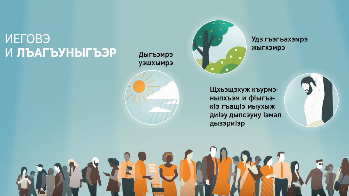 c СУРЭТЫР. Иеговэ цІыхухэр псори фІыуэ елъагъу, и лэжьакІуэхэри абыхэм яхэту. Псалъэм папщІэ, дыгъэмрэ уэшхымрэ, удз гъэгъахэмрэ жыгхэмрэ абы цІыхубэм тыгъэу иритащ. Ауэ псом нэхърэ нэхъапэращи, дэтхэнэ зыми щхьэщэхуж къурмэныпхъэм и фІыгъэкІэ гъащІэ мыухыж диІэу дыпсэуну Іэмал дызэриІэращ.
