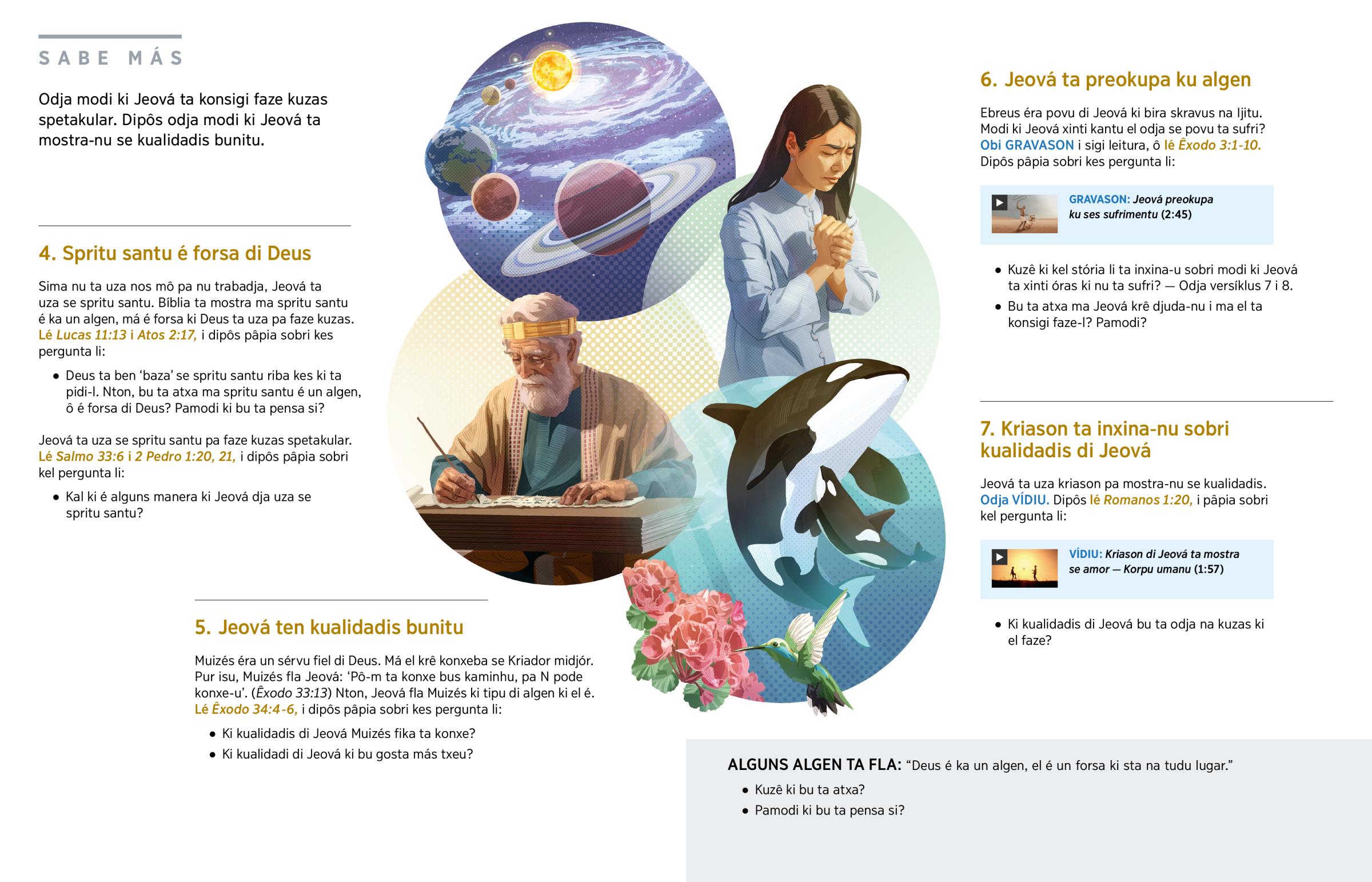 Óras ki bu ta pensa na Jeová, modi ki bu ta imajina ma el é? Bu ta atxa ma el é un algen txeu poderozu, má omésmu ténpu el sta lonji di nos, sima strélas la na séu? Ô bu ta atxa ma el é sô un forsa di naturéza, sima un strubada? Má modi ki Jeová é? Bíblia ta pâpia di alguns kualidadi di Jeová, i tanbê el ta fla ma el ta preokupa ku bo.