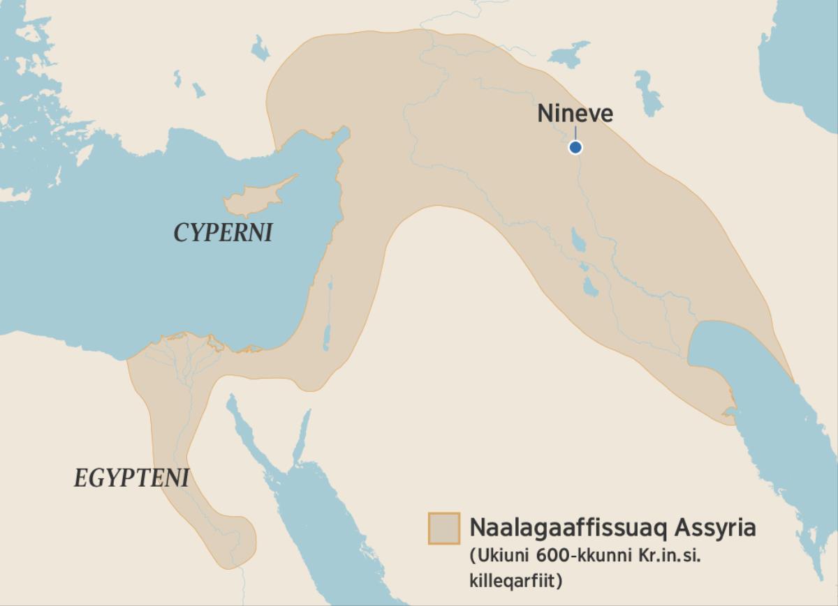 UKIUP 670-ip missaani Kr.in.si. Assyria nunarsuarmi naalagaaffissuit annersarilersimavaat. British Museumip nittartagaa naapertorlugu Assyria “kitaani Cypernimiit kangiani Iranimut isorartutigaaq, allaallumi Egypteni Assyriamut ukiuni arlalinni ilaasimavoq”. Assyriami illoqarfiit pingaarnersaat, Nineve, taamani nunarsuarmi illoqarfiit annersaraat. Illoqarfik taanna kusanartunik naatsiivippassuaqarpoq, illussaarsuaqarpoq angisuunillu atuagaateqarfeqarluni. Ninevetoqqami iikkani kigartukkanit ersersinneqarpoq kunngi Assurbanipali Assyriami kunngit allat assigalugit imminut ‘silarsuup kunngianik’ taagorsimasoq. Taamanikkut Assyria Ninevelu ajugaaffigineqarsinnaanngitsutut ipput.