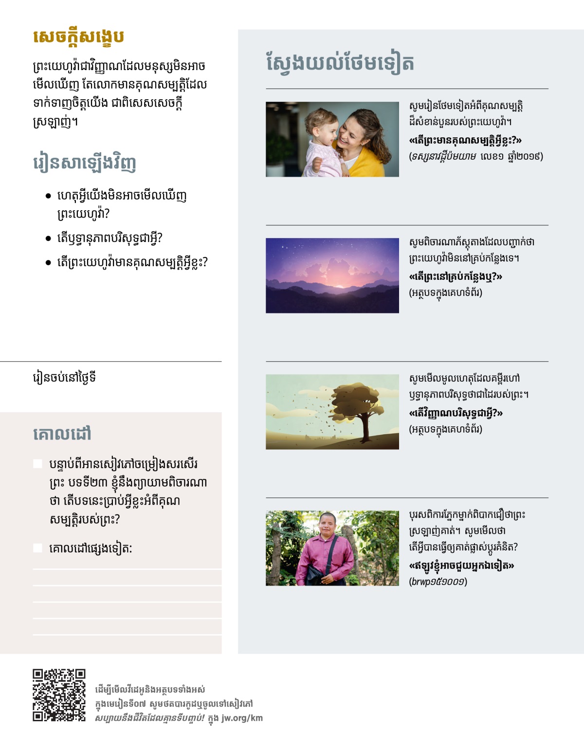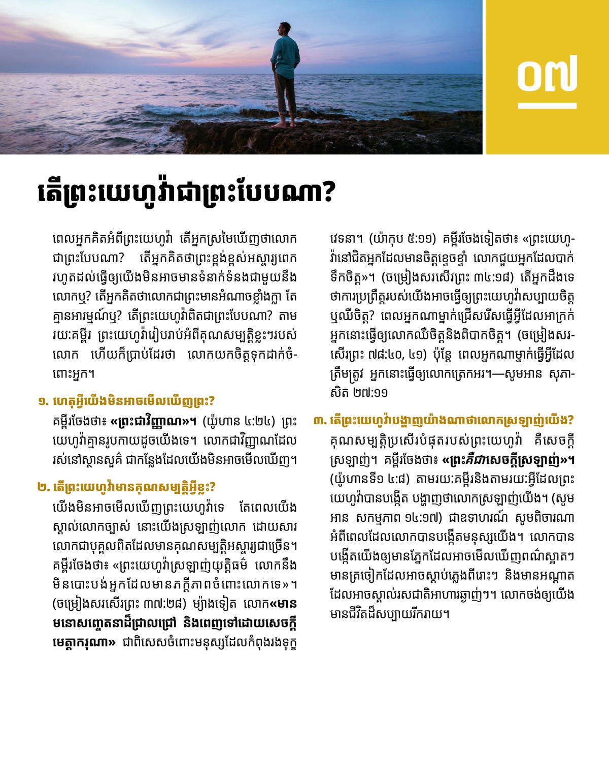 ពេលអ្នកគិតអំពីព្រះយេហូវ៉ា តើអ្នកស្រមៃឃើញថាលោកជាព្រះបែបណា? តើអ្នកគិតថាព្រះខ្ពង់ខ្ពស់អស្ចារ្យពេក រហូតដល់ធ្វើឲ្យយើងមិនអាចមានទំនាក់ទំនងជាមួយនឹងលោកឬ? តើអ្នកគិតថាលោកជាព្រះមានអំណាចខ្លាំងក្លា តែគ្មានអារម្មណ៍ឬ? តើព្រះយេហូវ៉ាពិតជាព្រះបែបណា? តាមរយៈគម្ពីរ ព្រះយេហូវ៉ារៀបរាប់អំពីគុណសម្បត្តិខ្លះៗរបស់លោក ហើយក៏ប្រាប់ដែរថា លោកយកចិត្តទុកដាក់ចំពោះអ្នក។