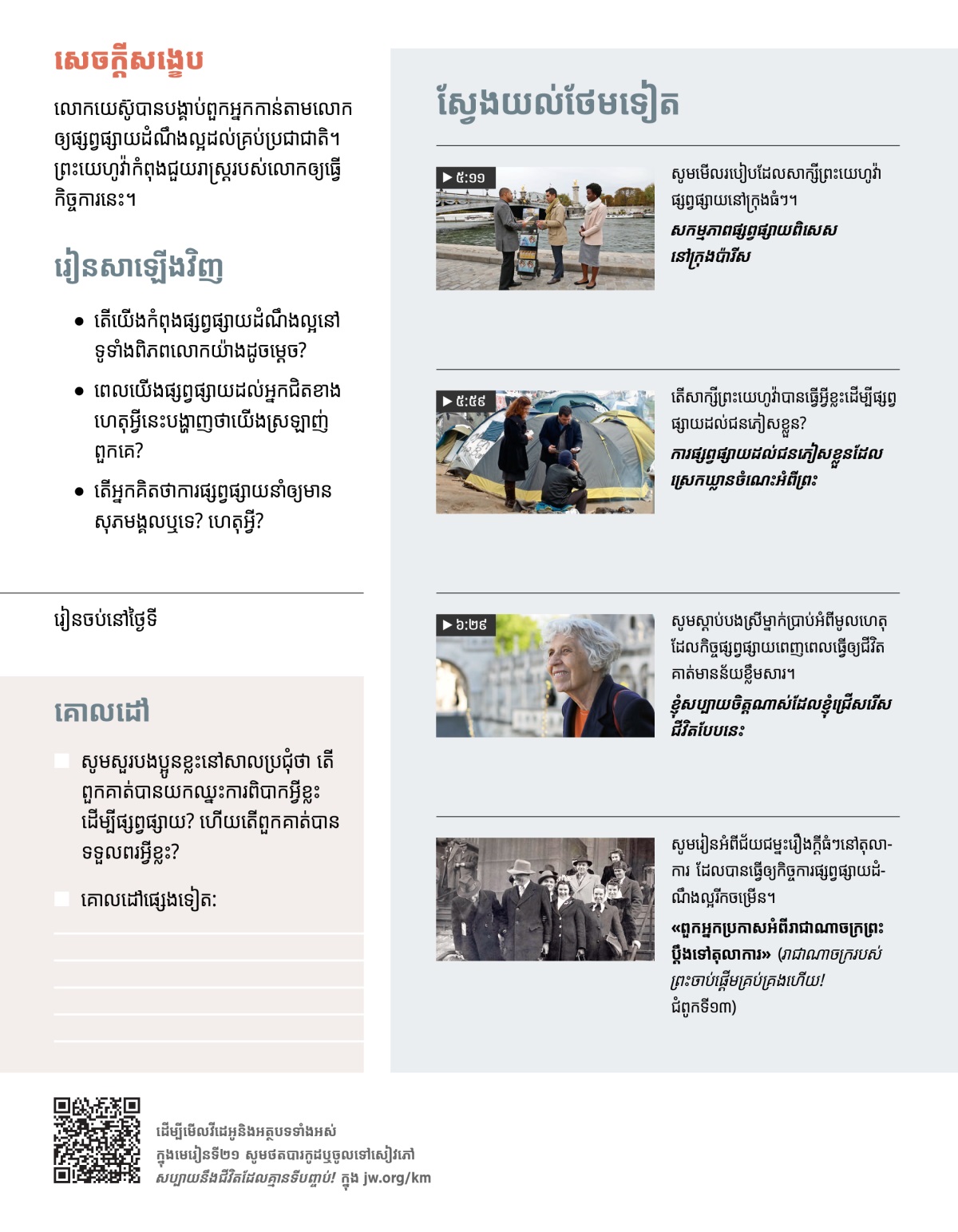 សាក្សីព្រះយេហូវ៉ាខំព្យាយាមយ៉ាងខ្លាំងដើម្បីផ្សព្វផ្សាយដល់មនុស្សគ្រប់ទីកន្លែង។ លេងវីដេអូ រួចពិភាក្សាសំណួរដូចតទៅ៖