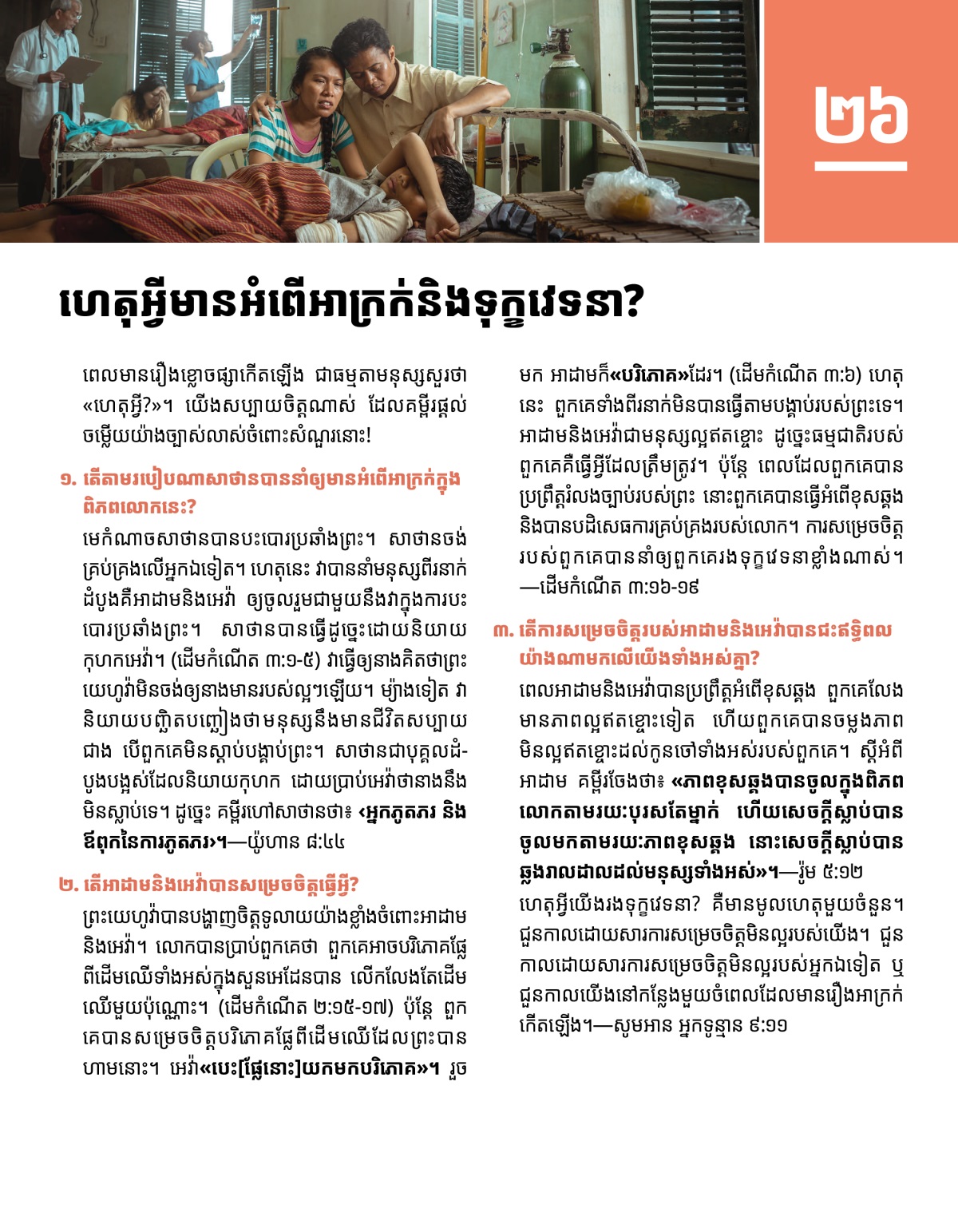 មេកំណាចសាថាននិងមនុស្សពីរនាក់ដំបូងជាដើមហេតុដែលនាំឲ្យមានអំពើអាក្រក់ក្នុងពិភពលោក។ ព្រះយេហូវ៉ាមិនសប្បាយចិត្តពេលយើងរងទុក្ខវេទនា ហើយបន្តិចទៀត លោកនឹងបំបាត់ចោលទុក្ខវេទនាទាំងអស់។