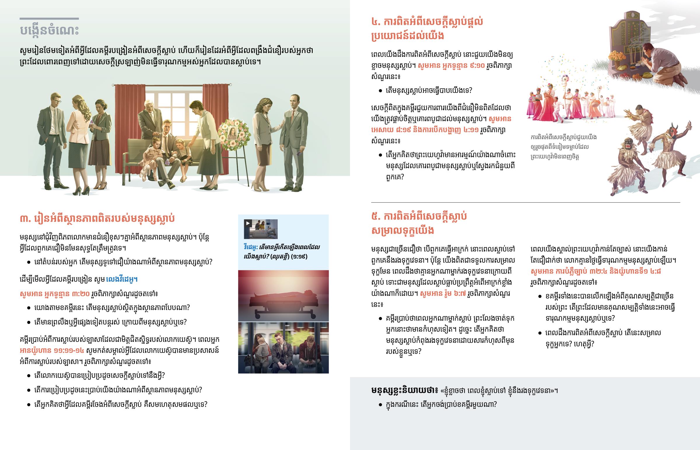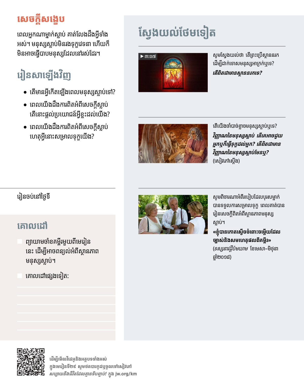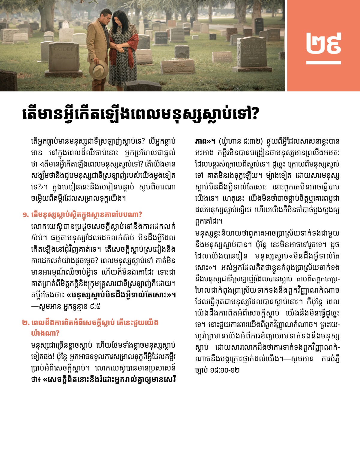 តើអ្នកធ្លាប់មានមនុស្សជាទីស្រឡាញ់ស្លាប់ទេ? បើអ្នកធ្លាប់មាន នៅក្នុងពេលដ៏ឈឺចាប់នោះ អ្នកប្រហែលជាឆ្ងល់ថា ‹តើមានអ្វីកើតឡើងពេលមនុស្សស្លាប់ទៅ? តើយើងមានសង្ឃឹមថានឹងជួបមនុស្សជាទីស្រឡាញ់របស់យើងម្ដងទៀតទេ?›។ ក្នុងមេរៀននេះនិងមេរៀនបន្ទាប់ សូមពិចារណាចម្លើយពីគម្ពីរដែលសម្រាលទុក្ខយើង។