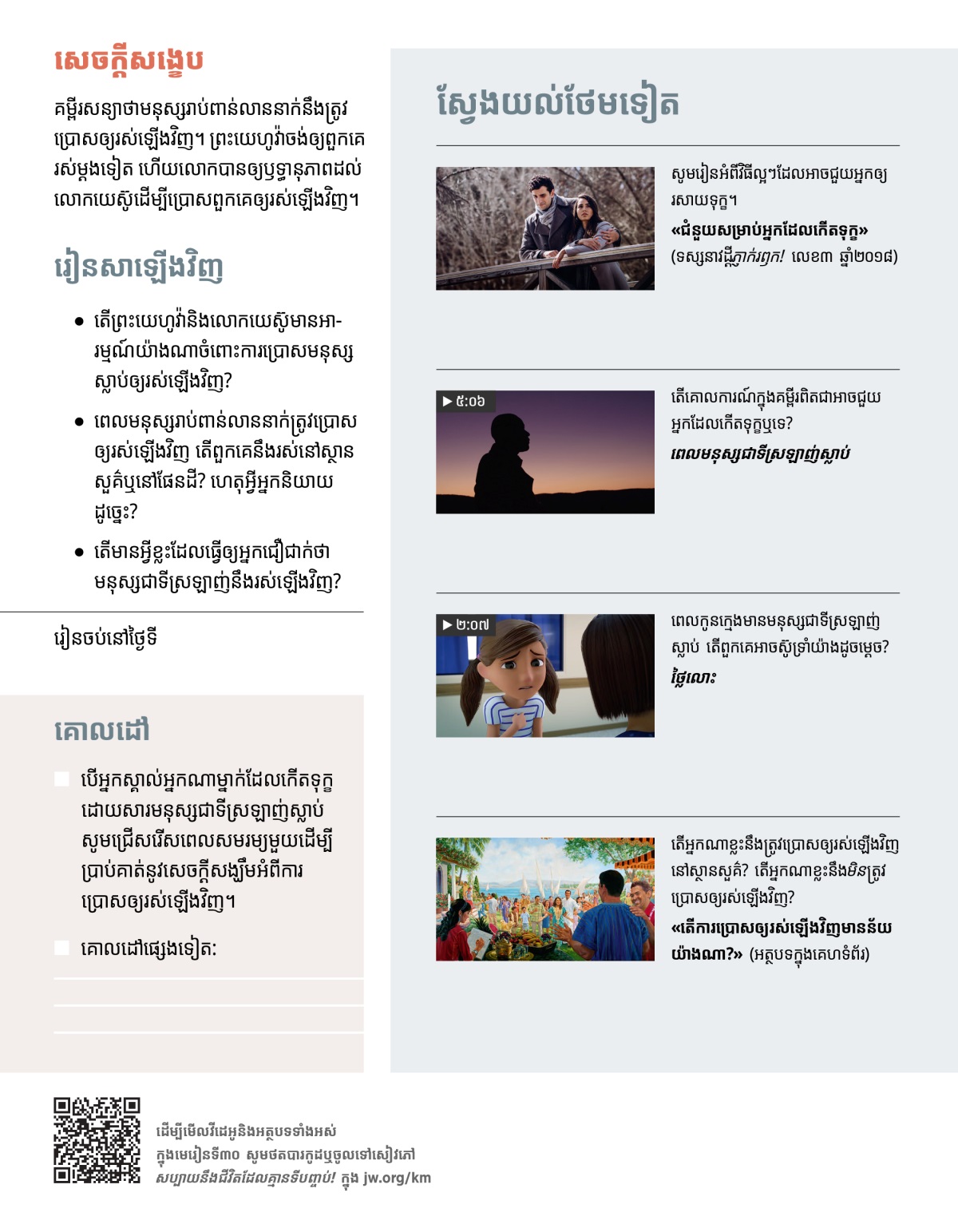 ពេល​មនុស្ស​ជា​ទី​ស្រឡាញ់​របស់​យើង​ស្លាប់ នោះ​ធ្វើ​ឲ្យ​យើង​កើត​ទុក្ខ​និង​ឈឺ​ចាប់​ខ្លាំង​ណាស់។ នេះ​ជា​មូលហេតុ​ដែល​គម្ពីរ​ហៅ​សេចក្ដី​ស្លាប់​ថា សត្រូវ។ (​កូរិនថូស​ទី​១ ១៥:២៦​) នៅ​ក្នុង​មេ​រៀន​ទី​២៧ អ្នក​បាន​រៀន​ថា​ព្រះ​យេហូវ៉ា​នឹង​បំផ្លាញ​សត្រូវ​នោះ​ចោល។ ប៉ុន្តែ ចុះ​យ៉ាង​ណា​វិញ​ចំពោះ​មនុស្ស​ដែល​បាន​ស្លាប់​ហើយ? ក្នុង​មេ​រៀន​នេះ អ្នក​នឹង​រៀន​អំពី​សេចក្ដី​សន្យា​មួយ​ទៀត​របស់​ព្រះ​យេហូវ៉ា ពោល​គឺ​លោក​នឹង​ប្រោស​មនុស្ស​រាប់​ពាន់​លាន​នាក់​ឲ្យ​រស់​ឡើង​វិញ! ហើយ​ឲ្យ​ពួក​គេ​សប្បាយ​នឹង​ជីវិត​ដែល​គ្មាន​ទី​បញ្ចប់។ តើ​នោះ​ពិត​ជា​អាច​កើត​ឡើង​ឬ​ទេ? តើ​ពួក​គេ​នឹង​ត្រូវ​ប្រោស​ឲ្យ​រស់​ឡើង​វិញ​នៅ​ស្ថាន​សួគ៌ ឬ​នៅ​ផែនដី?