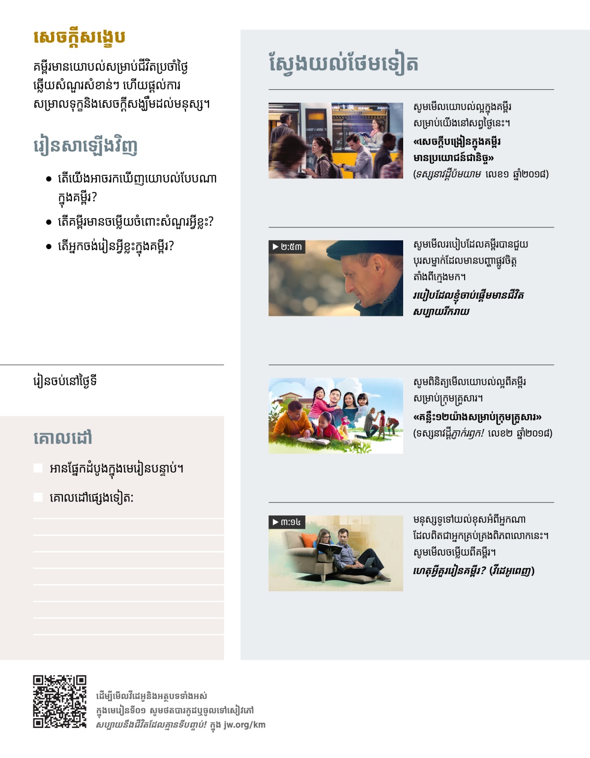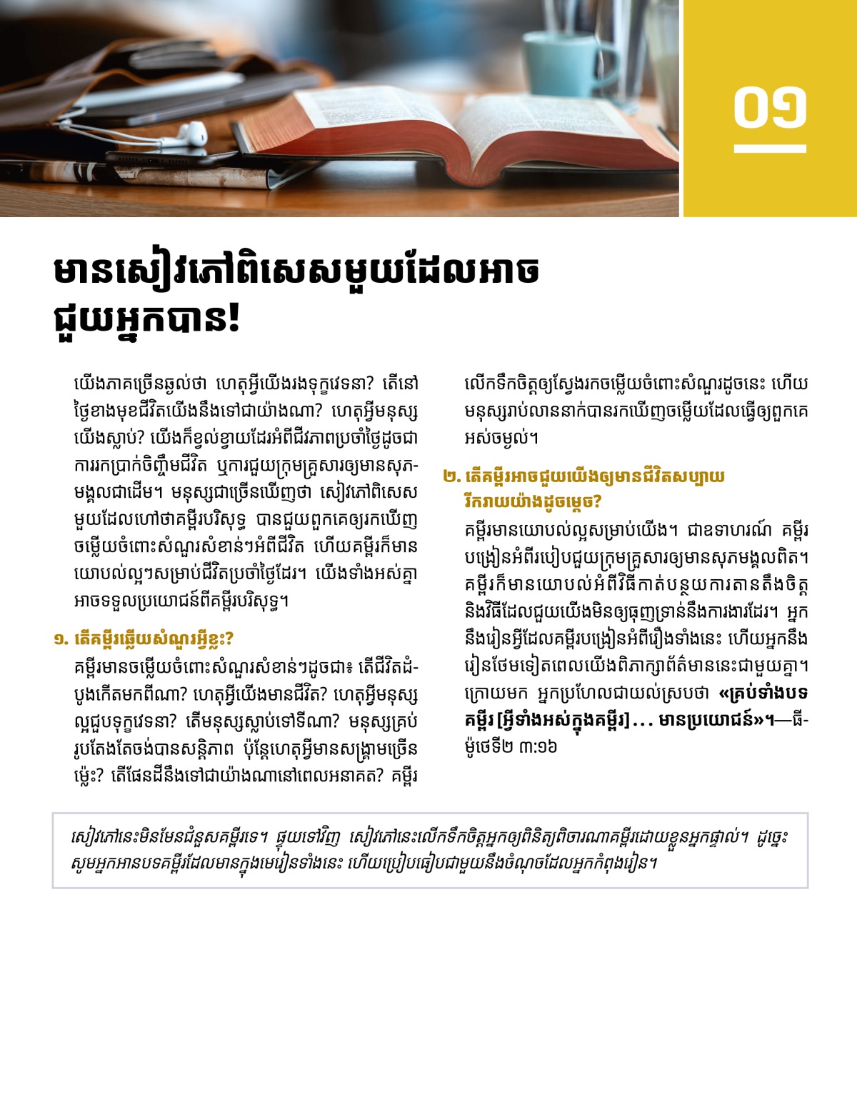យើងភាគច្រើនឆ្ងល់ថា ហេតុអ្វីយើងរងទុក្ខវេទនា? តើនៅថ្ងៃខាងមុខជីវិតយើងនឹងទៅជាយ៉ាងណា? ហេតុអ្វីមនុស្សយើងស្លាប់? យើងក៏ខ្វល់ខ្វាយដែរអំពីជីវភាពប្រចាំថ្ងៃដូចជា ការរកប្រាក់ចិញ្ចឹមជីវិត ឬការជួយក្រុមគ្រួសារឲ្យមានសុភមង្គលជាដើម។ មនុស្សជាច្រើនឃើញថា សៀវភៅពិសេសមួយដែលហៅថាគម្ពីរបរិសុទ្ធ បានជួយពួកគេឲ្យរកឃើញចម្លើយចំពោះសំណួរសំខាន់ៗអំពីជីវិត ហើយគម្ពីរក៏មានយោបល់ល្អៗសម្រាប់ជីវិតប្រចាំថ្ងៃដែរ។ យើងទាំងអស់គ្នាអាចទទួលប្រយោជន៍ពីគម្ពីរបរិសុទ្ធ។