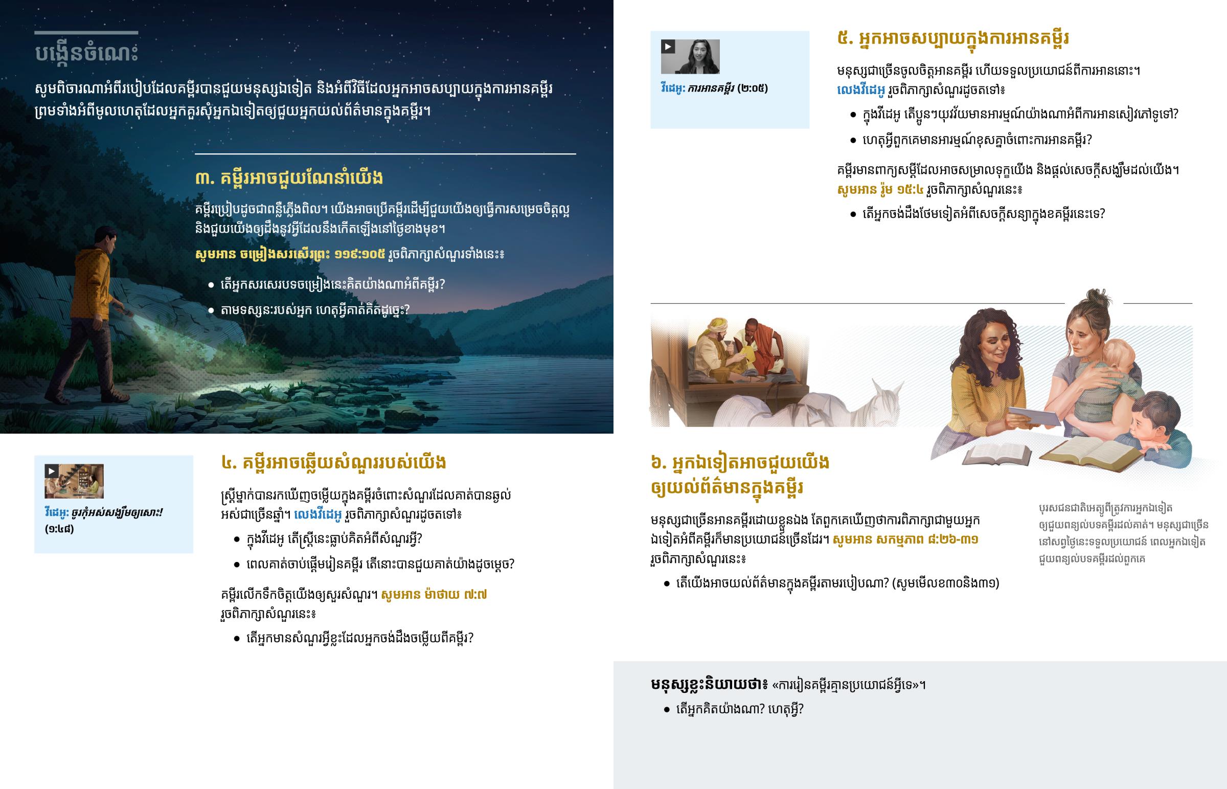 សូមពិចារណាអំពីរបៀបដែលគម្ពីរបានជួយមនុស្សឯទៀត និងអំពីវិធីដែលអ្នកអាចសប្បាយក្នុងការអានគម្ពីរ ព្រមទាំងអំពីមូលហេតុដែលអ្នកគួរសុំអ្នកឯទៀតឲ្យជួយអ្នកយល់ព័ត៌មានក្នុងគម្ពីរ។