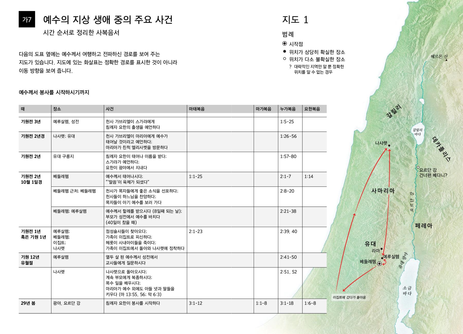 다음의 도표 옆에는 예수께서 여행하고 전파하신 경로를 보여 주는 지도가 있습니다. 지도에 있는 화살표는 정확한 경로를 표시한 것이 아니라 이동 방향을 보여 줍니다.