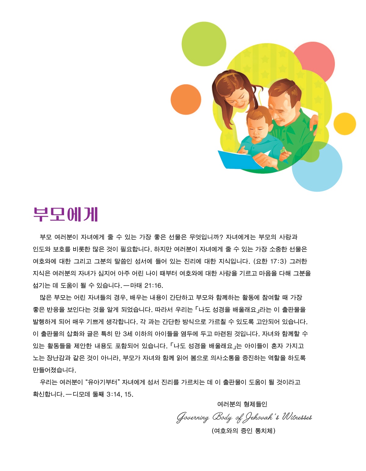 많은 부모는 어린 자녀들의 경우, 배우는 내용이 간단하고 부모와 함께하는 활동에 참여할 때 가장 좋은 반응을 보인다는 것을 알게 되었습니다. 따라서 우리는 「나도 성경을 배울래요」라는 이 출판물을 발행하게 되어 매우 기쁘게 생각합니다. 각 과는 간단한 방식으로 가르칠 수 있도록 고안되어 있습니다. 이 출판물의 삽화와 글은 특히 만 3세 이하의 아이들을 염두에 두고 마련된 것입니다. 자녀와 함께할 수 있는 활동들을 제안한 내용도 포함되어 있습니다. 「나도 성경을 배울래요」는 아이들이 혼자 가지고 노는 장난감과 같은 것이 아니라, 부모가 자녀와 함께 읽어 봄으로 의사소통을 증진하는 역할을 하도록 만들어졌습니다.