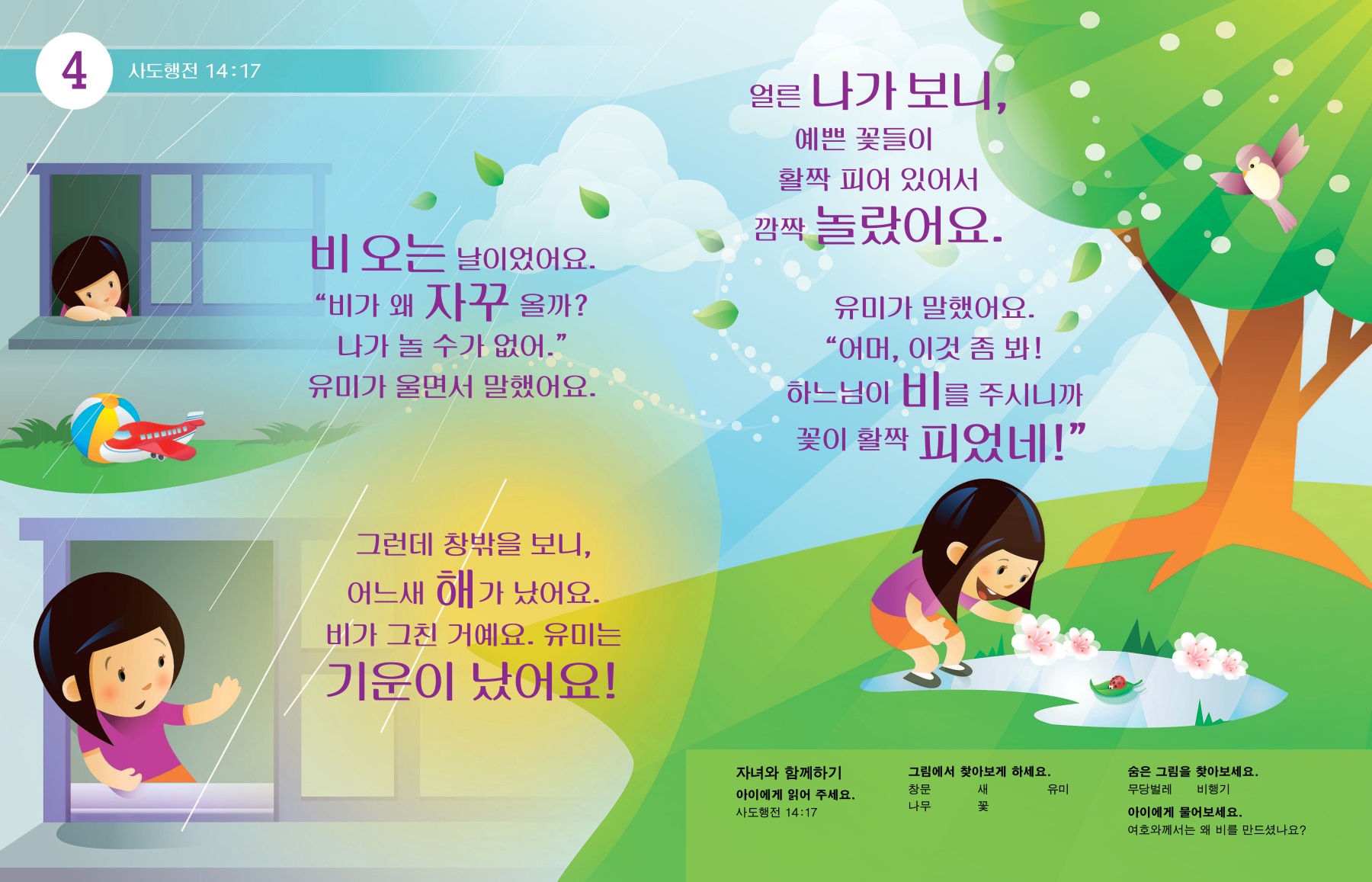 유미가 말했어요. “어머, 이것 좀 봐! 하느님이 비를 주시니까 꽃이 활짝 피었네!”