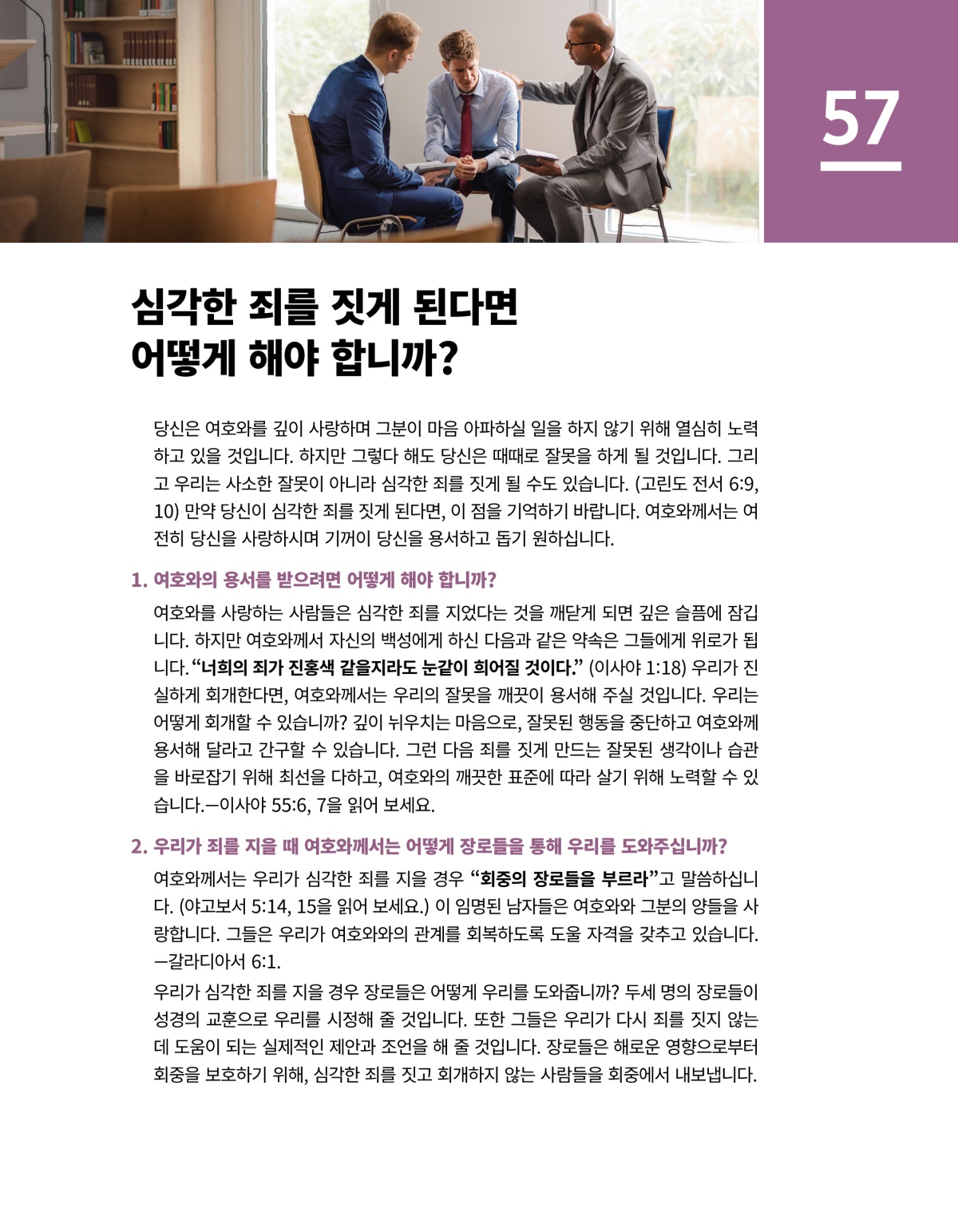 우리가 심각한 죄를 지을 경우 장로들은 어떻게 우리를 도와줍니까? 두세 명의 장로들이 성경의 교훈으로 우리를 시정해 줄 것입니다. 또한 그들은 우리가 다시 죄를 짓지 않는 데 도움이 되는 실제적인 제안과 조언을 해 줄 것입니다. 장로들은 해로운 영향으로부터 회중을 보호하기 위해, 심각한 죄를 짓고 회개하지 않는 사람들을 회중에서 내보냅니다.