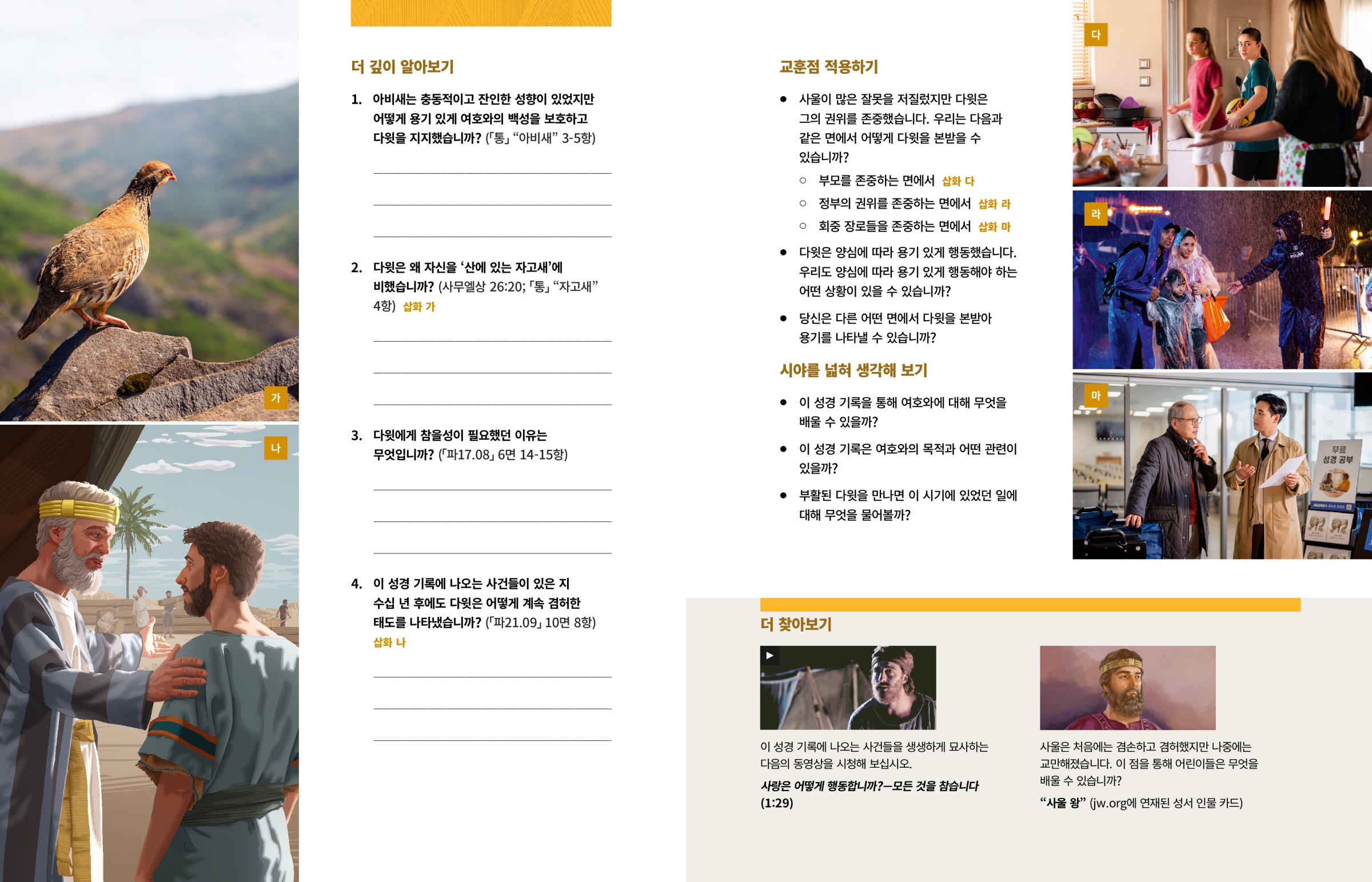 • 다윗은 양심에 따라 용기 있게 행동했습니다. 우리도 양심에 따라 용기 있게 행동해야 하는 어떤 상황이 있을 수 있습니까?