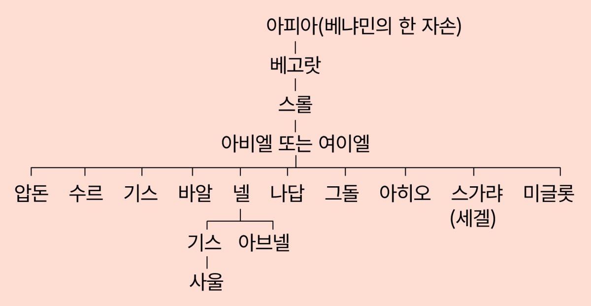 아비엘과 여이엘 둘 다 동일인의 이름들이라면, 이 도표에 있는 것과 같은 계보가 나오게 된다.