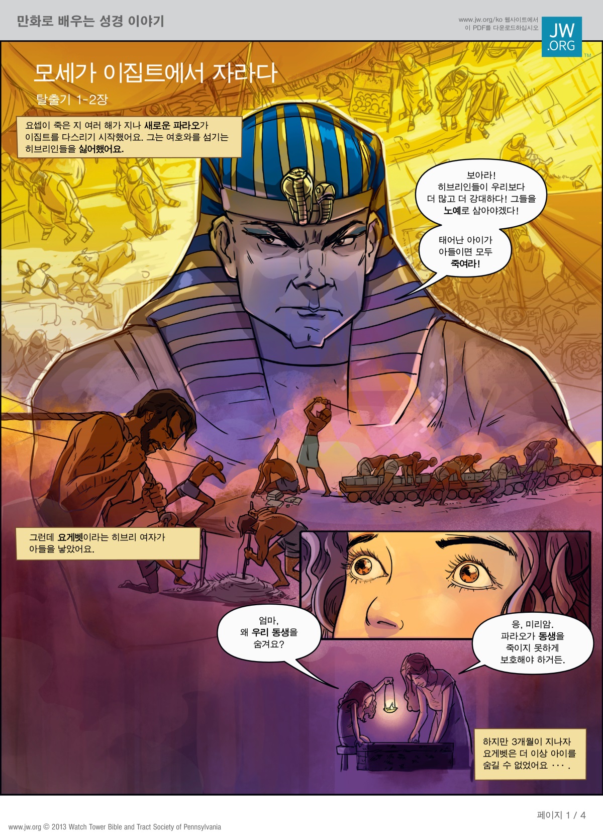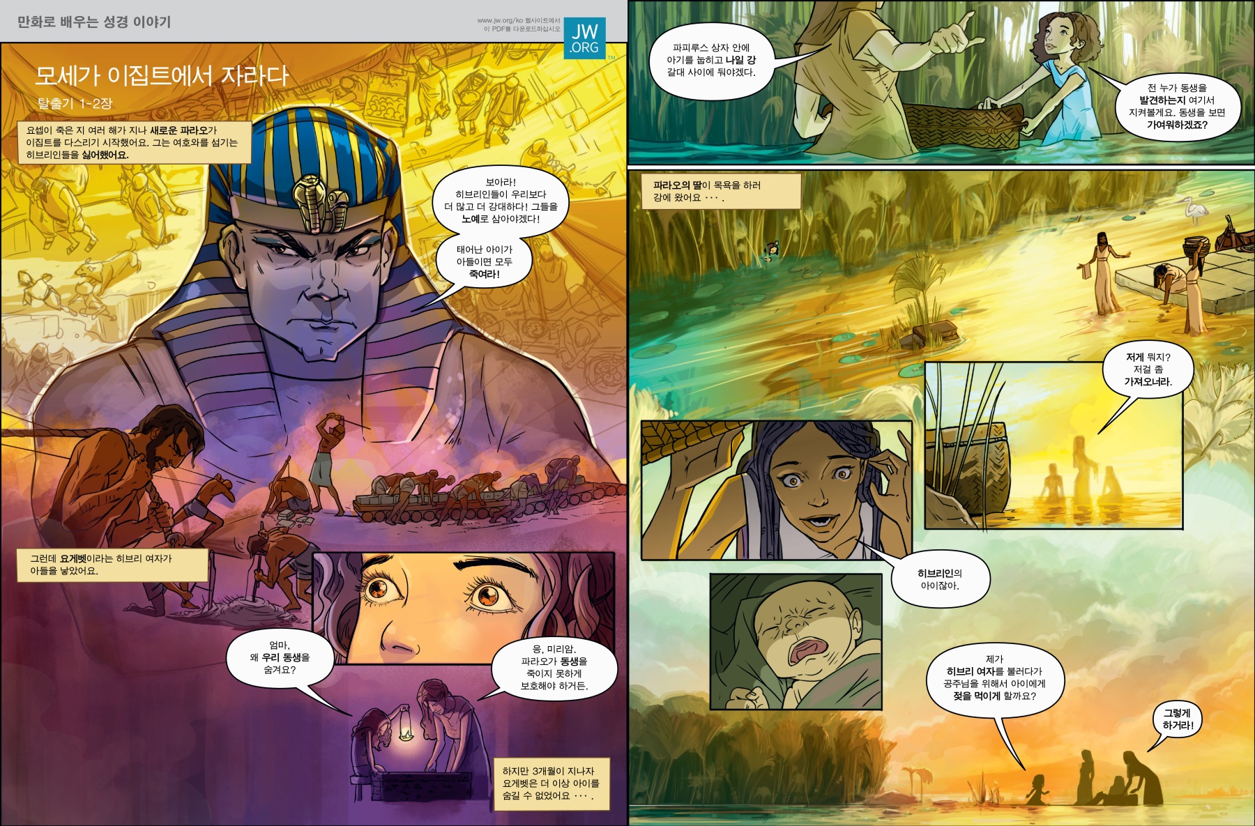 만화로 배우는 성경 이야기 모세가 이집트에서 자라다 아기 모세가 어떻게 이집트의 잔인한 파라오에게서 살아남았는지 알아보세요. 만화로 배우는 이 이야기를 다운로드해서 읽거나 인쇄해서 읽어 보세요. 다운로드
