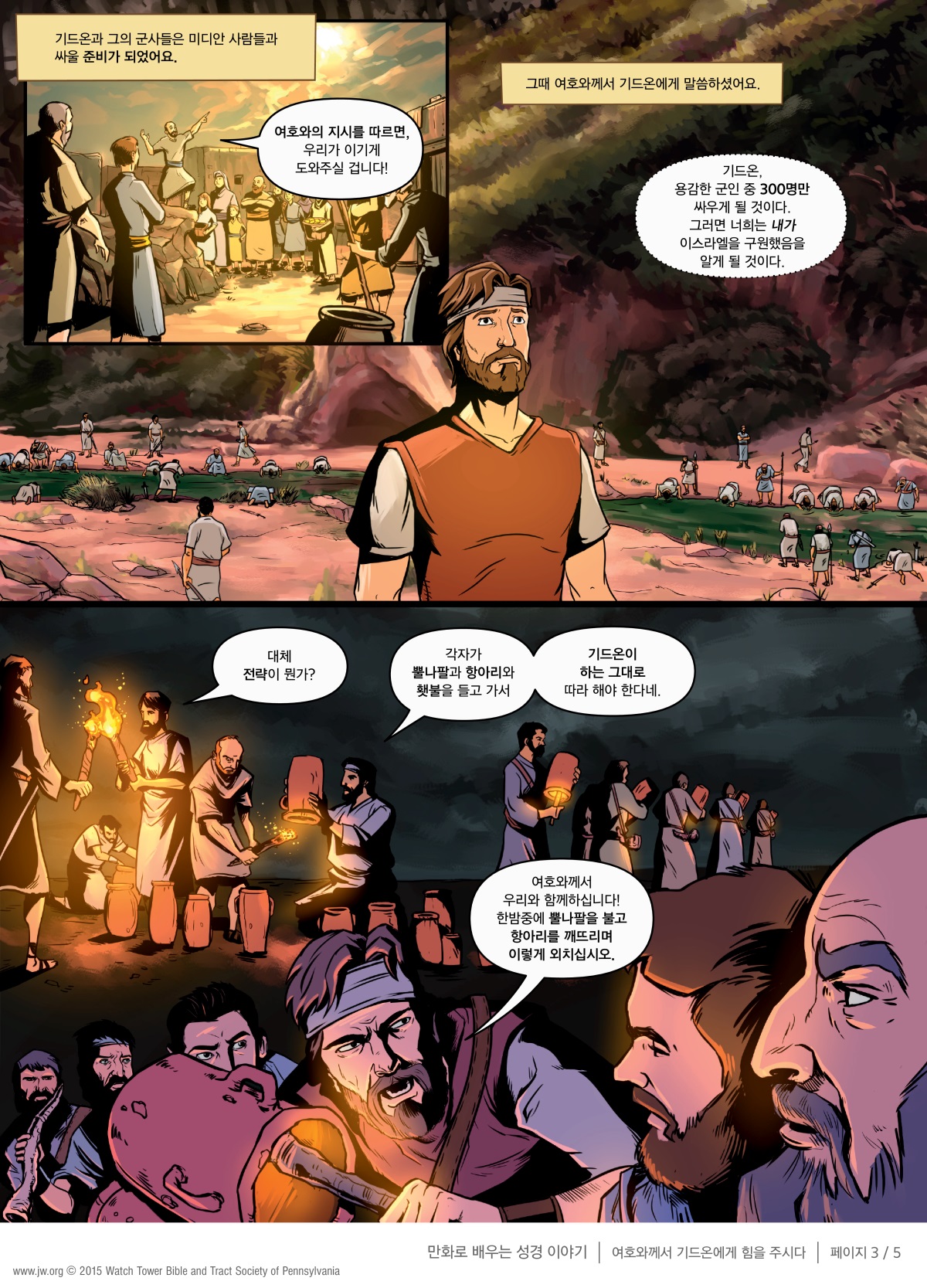 만화로 배우는 성경 이야기 여호와께서 기드온에게 힘을 주시다 미디안이 이스라엘을 괴롭힐 때, 여호와께서는 어떻게 기드온을 도와주셨을까요? 만화로 배우는 이 이야기를 다운로드해서 읽거나 인쇄해서 읽어 보세요. 다운로드
