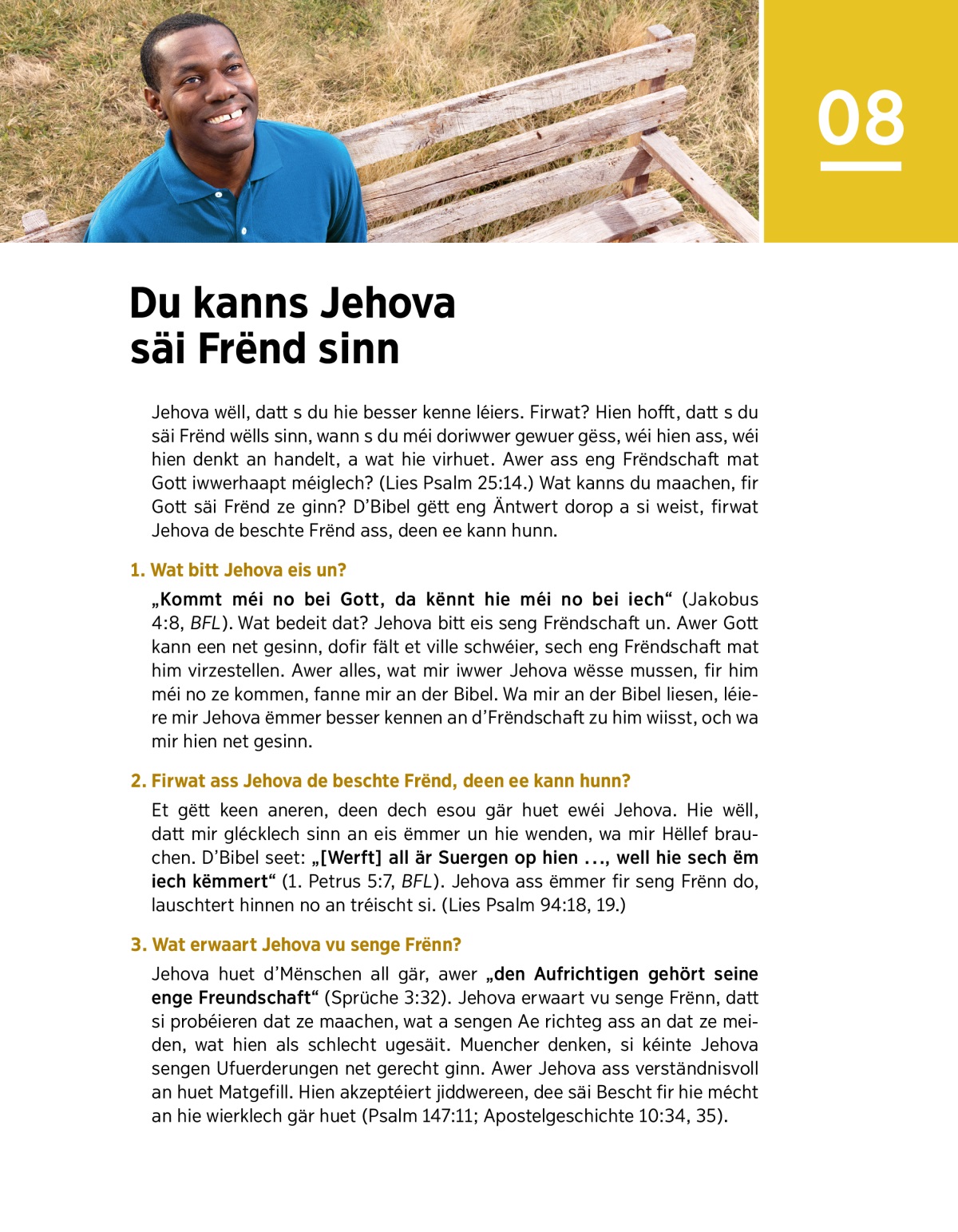Jehova wëll, datt s du hie besser kenne léiers. Firwat? Hien hofft, datt s du säi Frënd wëlls sinn, wann s du méi doriwwer gewuer gëss, wéi hien ass, wéi hien denkt an handelt, a wat hie virhuet. Awer ass eng Frëndschaft mat Gott iwwerhaapt méiglech? (Lies Psalm 25:14.) Wat kanns du maachen, fir Gott säi Frënd ze ginn? D’Bibel gëtt eng Äntwert dorop a si weist, firwat Jehova de beschte Frënd ass, deen ee kann hunn.