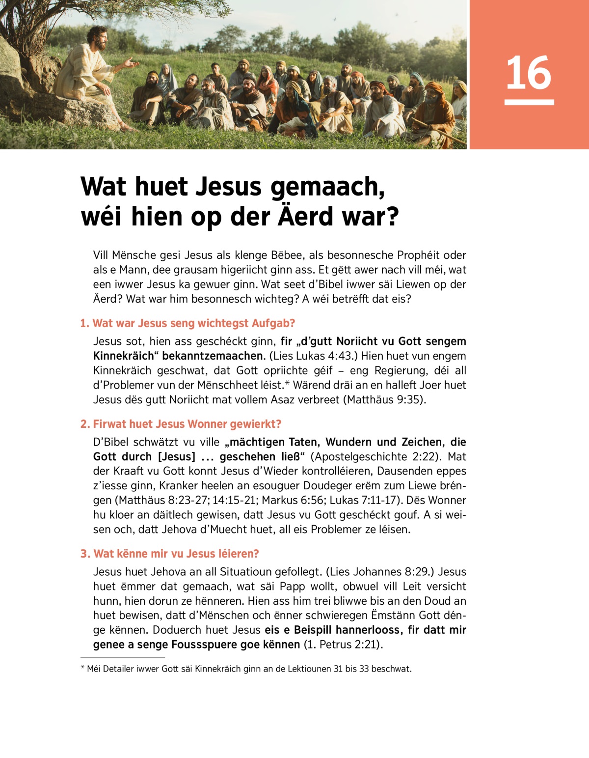 Vill Mënsche gesi Jesus als klenge Bëbee, als besonnesche Prophéit oder als e Mann, dee grausam higeriicht ginn ass. Et gëtt awer nach vill méi, wat een iwwer Jesus ka gewuer ginn. Wat seet d’Bibel iwwer säi Liewen op der Äerd? Wat war him besonnesch wichteg? A wéi betrëfft dat eis?