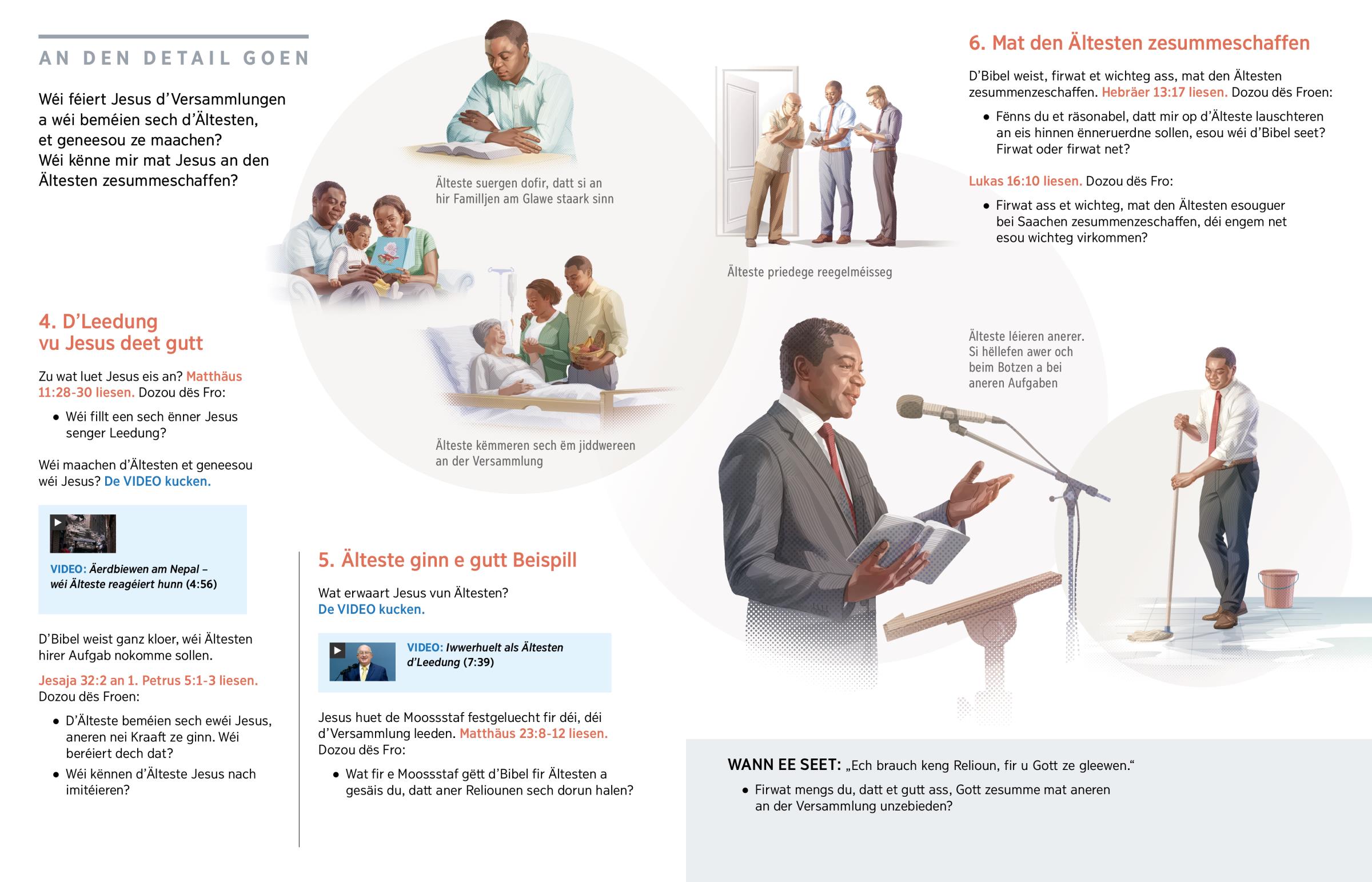 Jesus leet d’Versammlung. D’Älteste loossen sech vu Jesus leeden. Si këmmeren sech ëm d’Versammlung a ginn e gutt Beispill. Dofir schaffe mir gär mat hinnen zesummen.