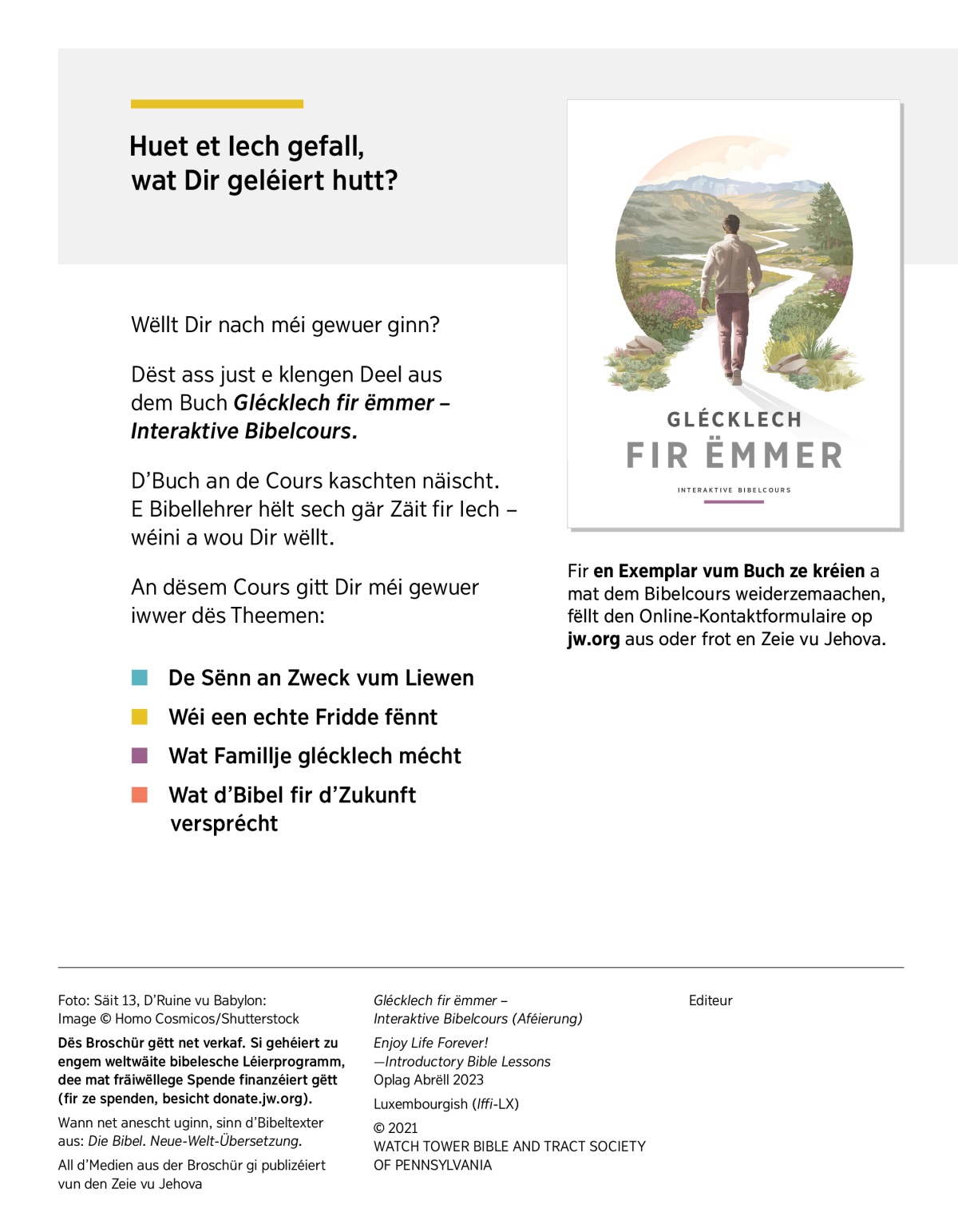 Fir en Exemplar vum Buch ze kréien a mat dem Bibelcours weiderzemaachen, fëllt den Online-Kontaktformulaire op jw.org aus oder frot en Zeie vu Jehova.