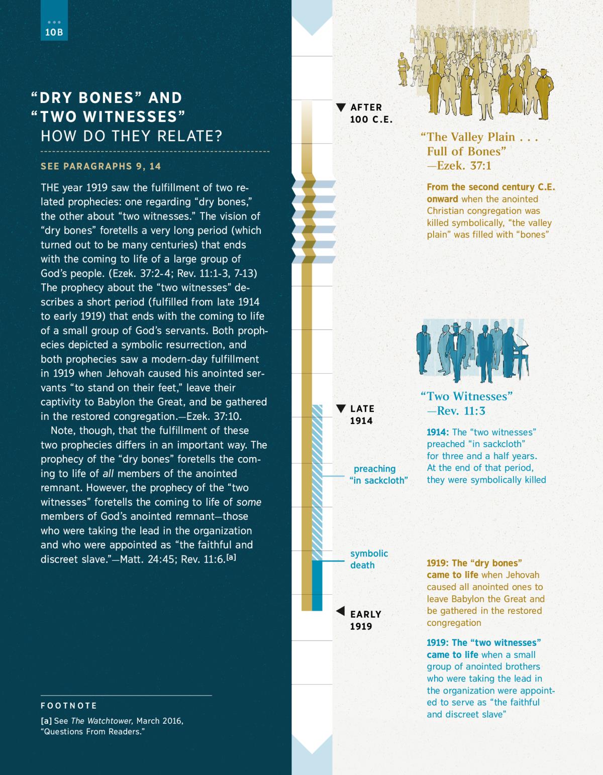 Note, though, that the fulfillment of these two prophecies differs in an important way. The prophecy of the “dry bones” foretells the coming to life of all members of the anointed remnant. However, the prophecy of the “two witnesses” foretells the coming to life of some members of God’s anointed remnant—those who were taking the lead in the organization and who were appointed as “the faithful and discreet slave.”—Matt. 24:45; Rev. 11:6.a