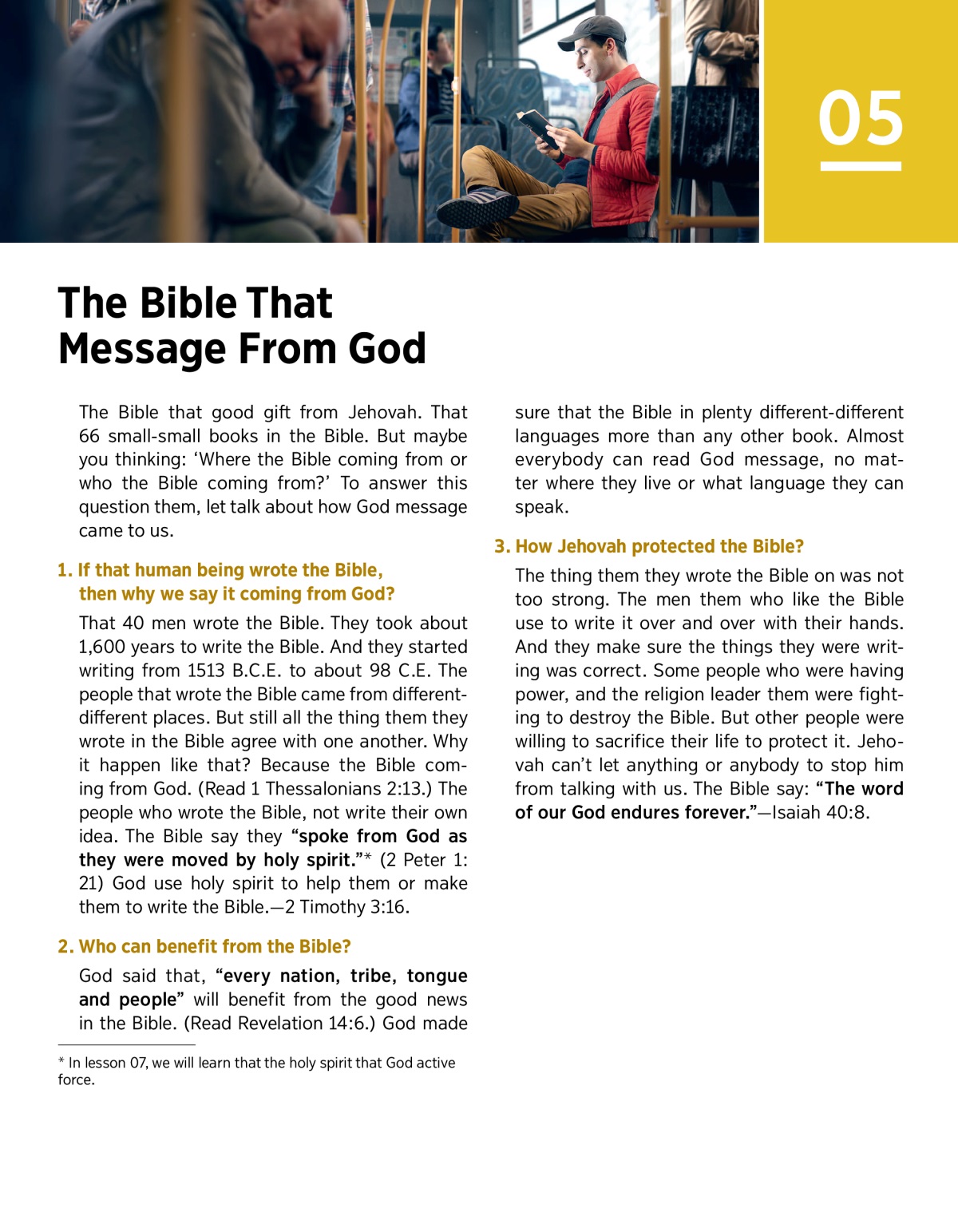 The Bible that good gift from Jehovah. That 66 small-small books in the Bible. But maybe you thinking: ‘Where the Bible coming from or who the Bible coming from?’ To answer this question them, let talk about how God message came to us.