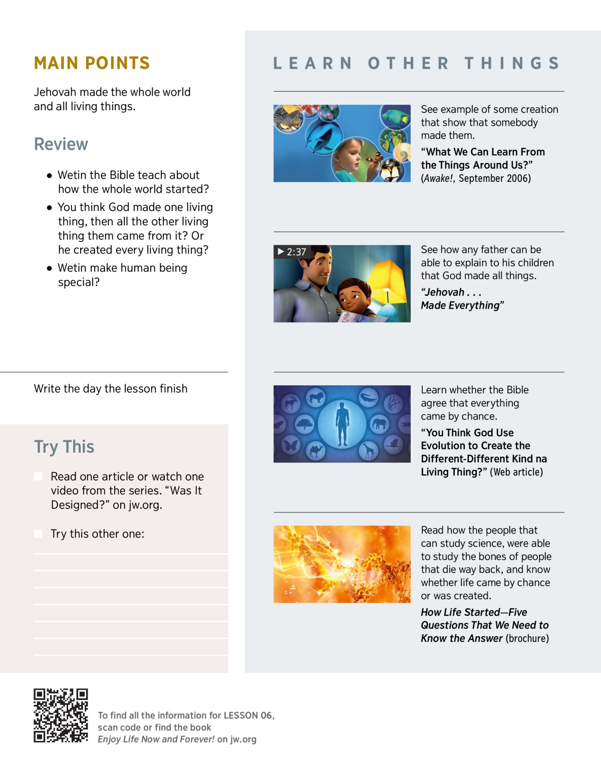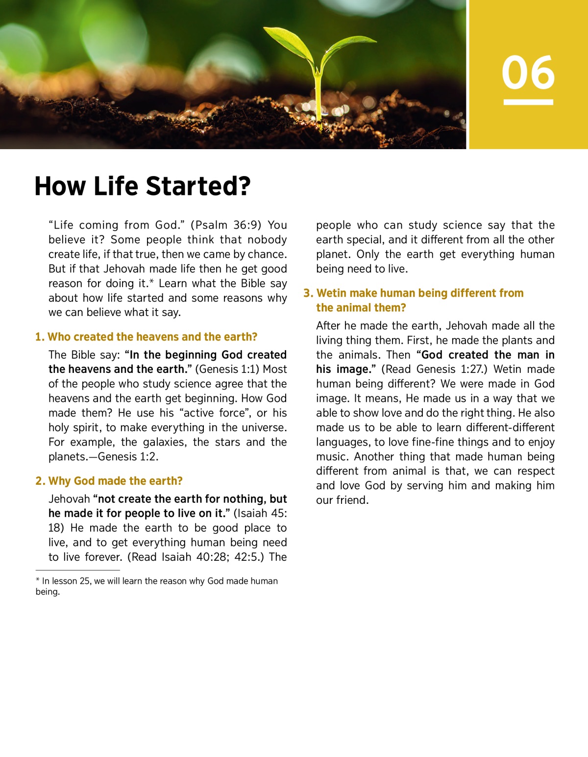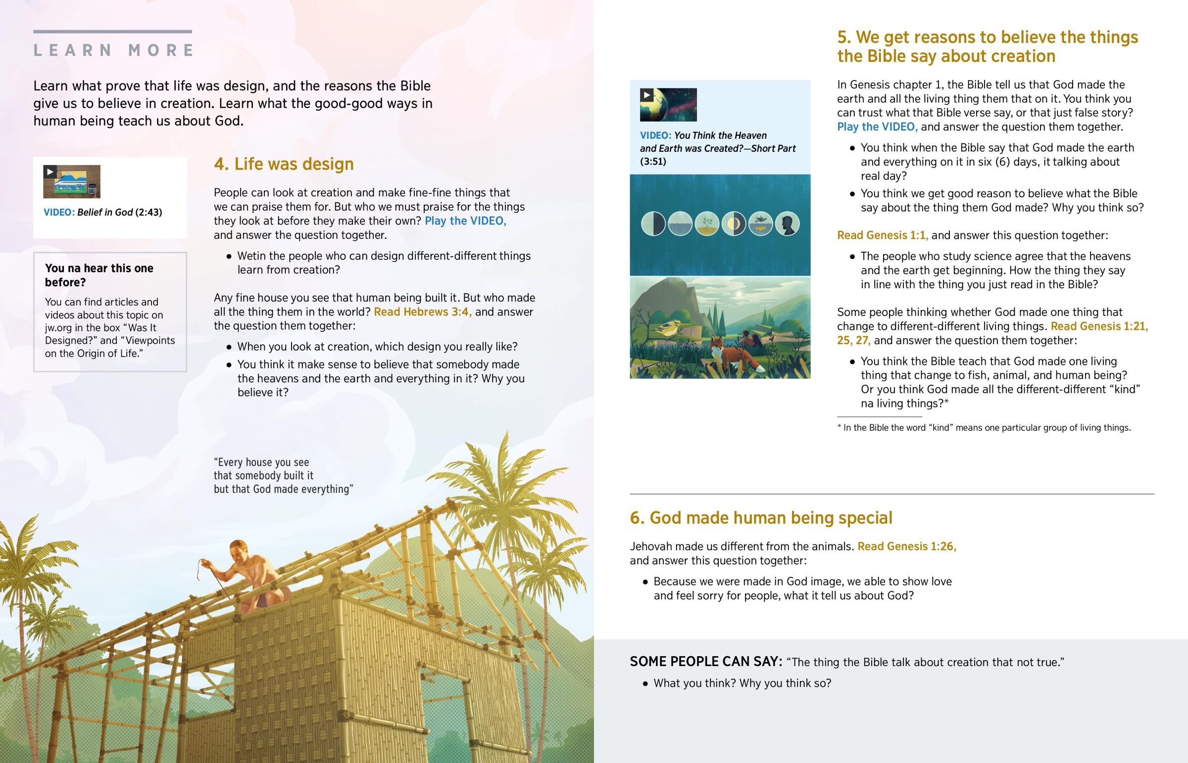 After he made the earth, Jehovah made all the living thing them. First, he made the plants and the animals. Then “God created the man in his image.” (Read Genesis 1:27.) Wetin made human being different? We were made in God image. It mean, He made us in a way that we able to show love and do the right thing. He also made us to be able to learn different-different languages, to love fine-fine things and to enjoy music. Another thing that made human being different from animal is that, we can respect and love God by serving him and making him our friend.