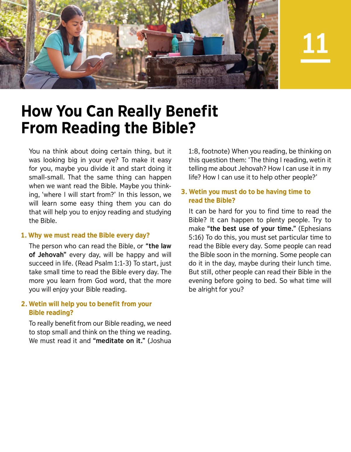 You na think about doing certain thing, but it was looking big in your eye? To make it easy for you, maybe you divide it and start doing it small-small. That the same thing can happen when we want read the Bible. Maybe you thinking, ‘where I will start from?’ In this lesson, we will learn some easy thing them you can do that will help you to enjoy reading and studying the Bible.
