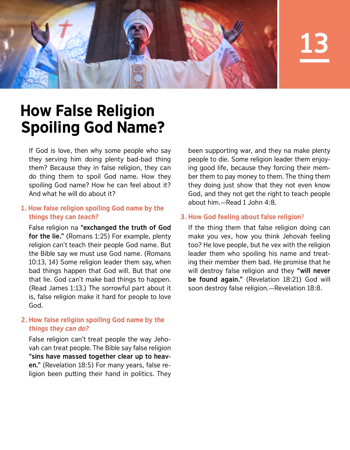 Learn more about how God feel about false religion. Learn also what false religion been doing and why it must not stop you from learning about Jehovah.
