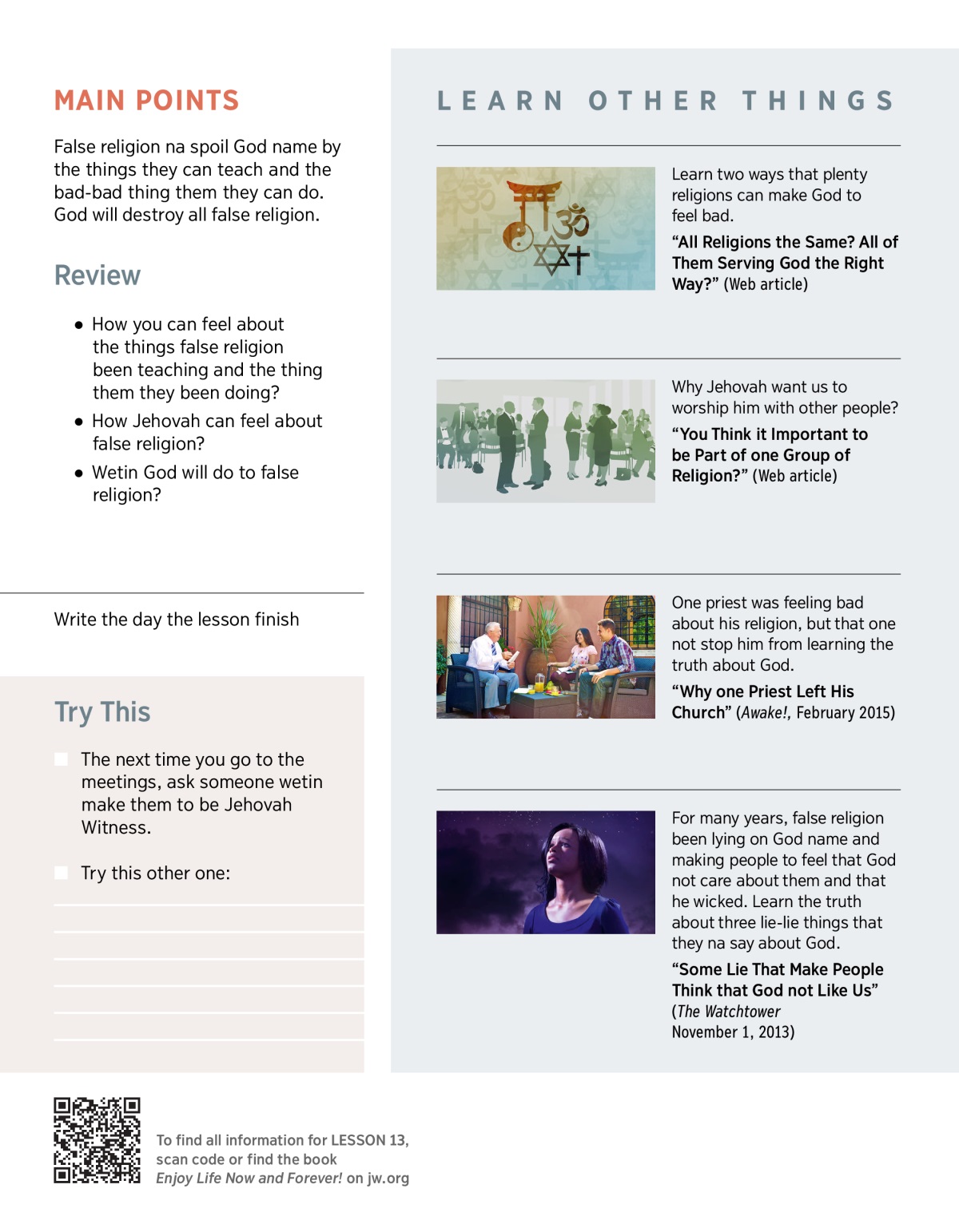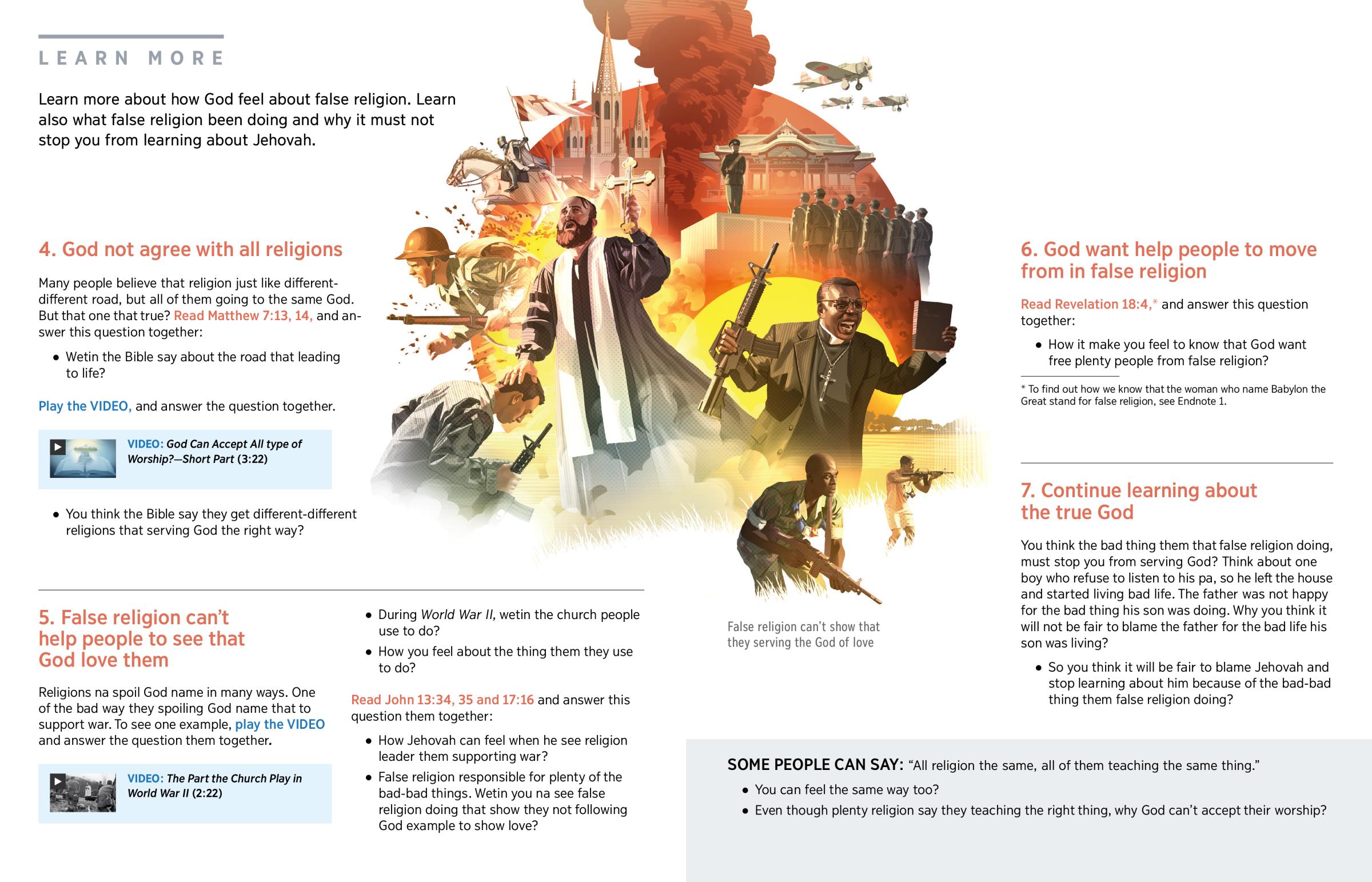 False religion can’t treat people the way Jehovah can treat people. The Bible say false religion “sins have massed together clear up to heaven.” (Revelation 18:5) For many years, false religion been putting their hand in politics. They been supporting war, and they na make plenty people to die. Some religion leader them enjoying good life, because they forcing their member them to pay money to them. The thing them they doing just show that they not even know God, and they not get the right to teach people about him.—Read 1 John 4:8.