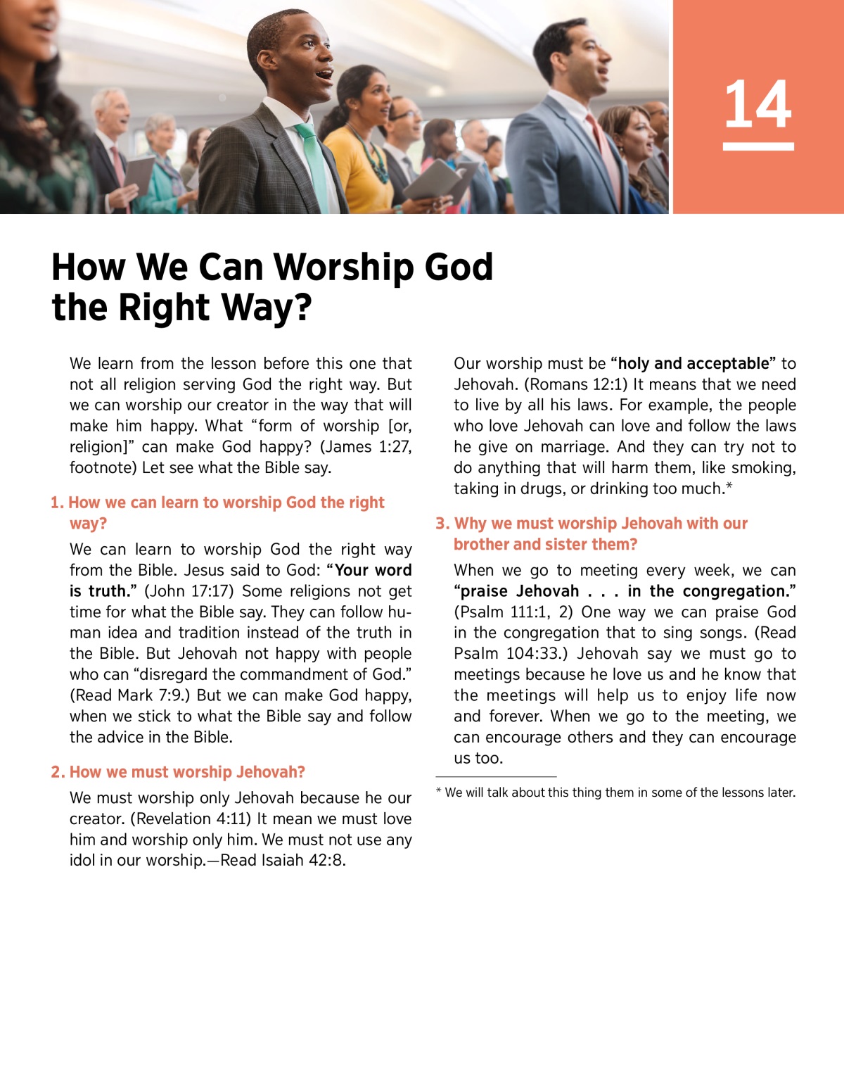We learn from the lesson before this one that not all religion serving God the right way. But we can worship our creator in the way that will make him happy. What “form of worship [or, religion]” can make God happy? (James 1:27, footnote) Let see what the Bible say.