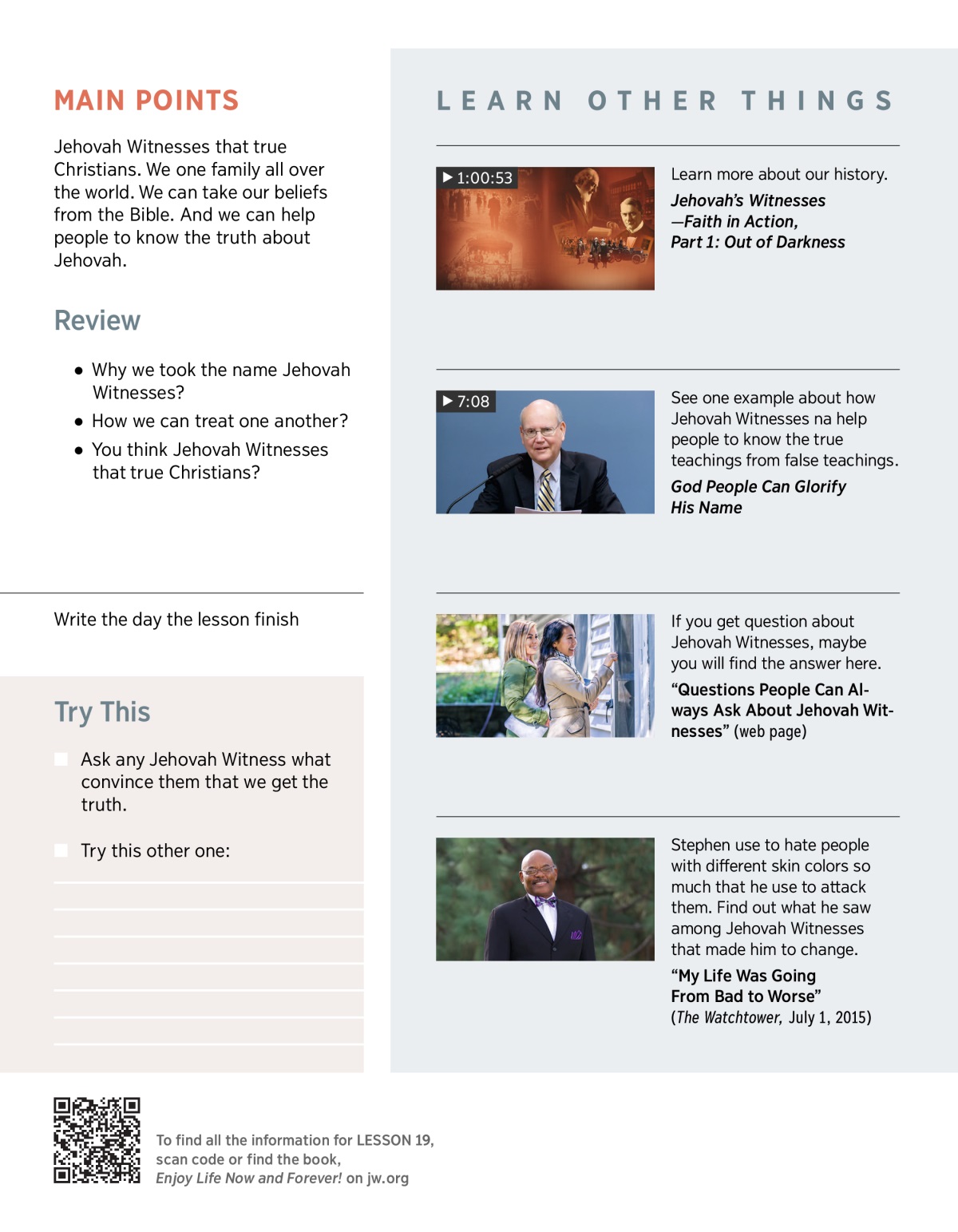 Jehovah Witnesses that true Christians. We one family all over the world. We can take our beliefs from the Bible. And we can help people to know the truth about Jehovah.