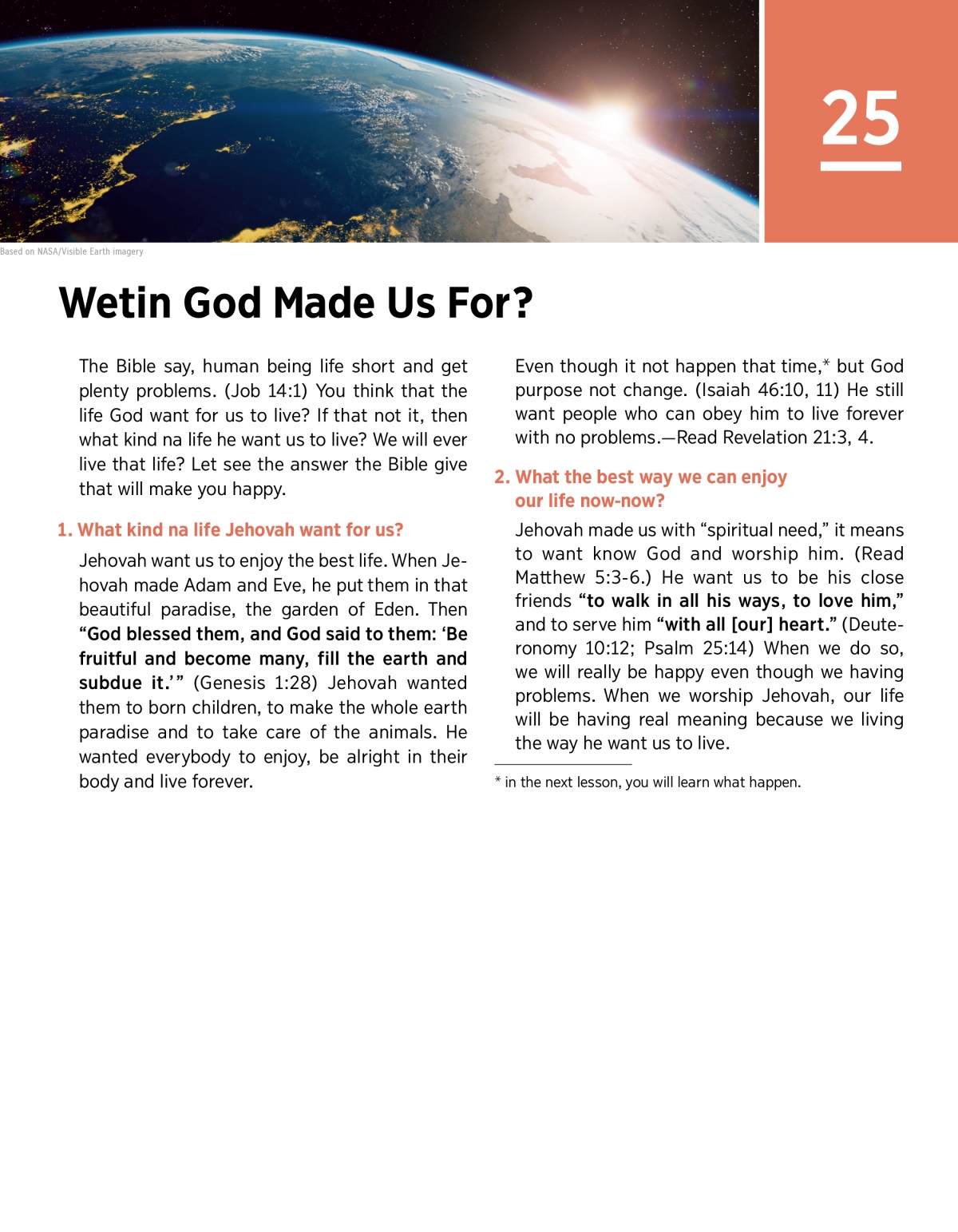 The Bible say, human being life short and get plenty problems. (Job 14:1) You think that the life God want for us to live? If that not it, then what kind na life he want us to live? We will ever live that life? Let see the answer the Bible give that will make you happy.