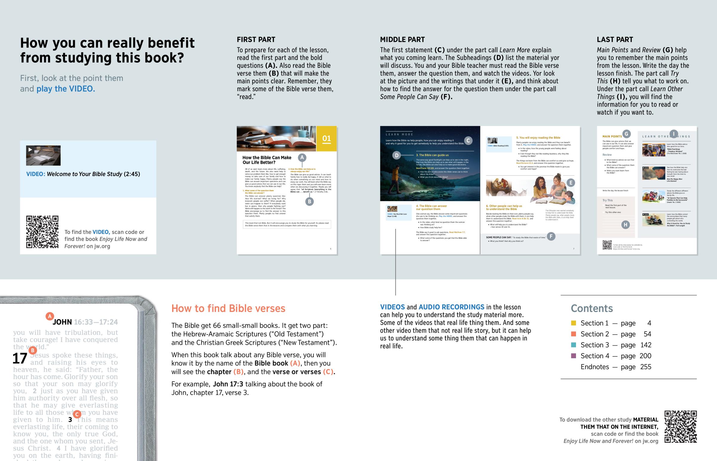 To prepare for each of the lesson, read the first part and the bold questions (A). Also read the Bible verse them (B) that will make the main points clear. Remember, they mark some of the Bible verse them, “read.”