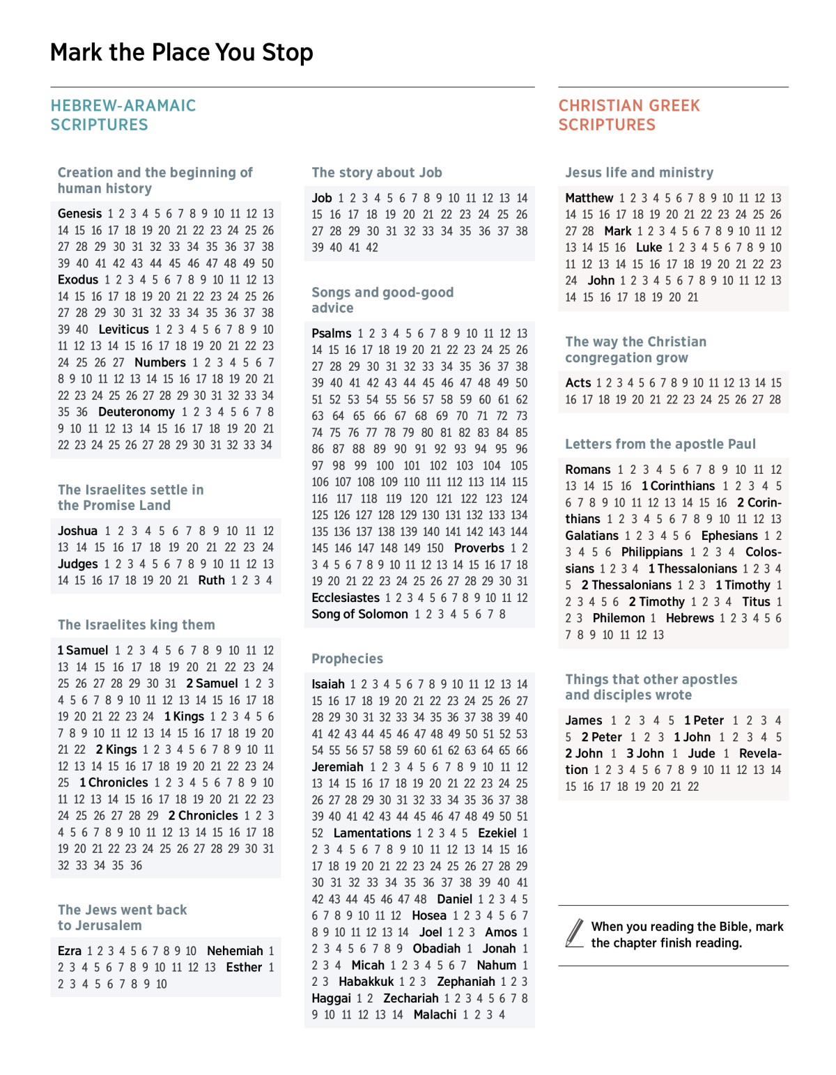 When you reading the Bible, mark the chapter you finish reading.