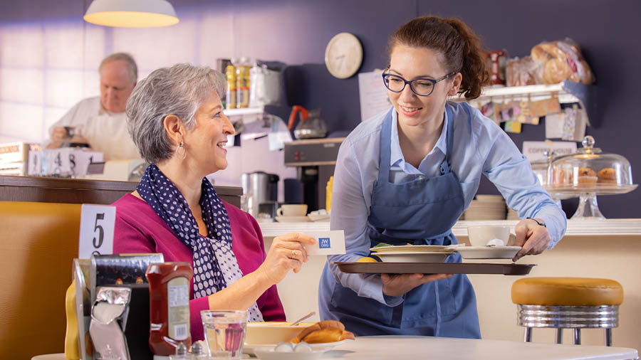 g PICTURE DESCRIPTION: After setting the goal of sharing in informal witnessing, a sister offers a contact card to the waitress who served her.