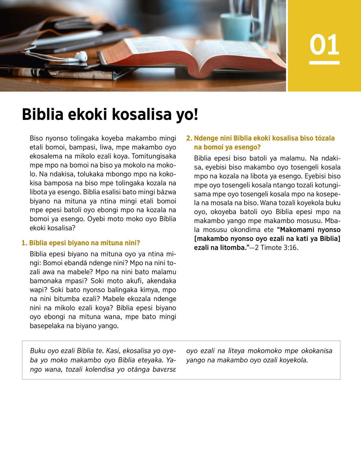 Biso nyonso tolingaka koyeba makambo mingi etali bomoi, bampasi, liwa, mpe makambo oyo ekosalema na mikolo ezali koya. Tomitungisaka mpe mpo na bomoi na biso ya mokolo na mokolo. Na ndakisa, tolukaka mbongo mpo na kokokisa bamposa na biso mpe tolingaka kozala na libota ya esengo. Biblia esalisi bato mingi bázwa biyano na mituna ya ntina mingi etali bomoi mpe epesi batoli oyo ebongi mpo na kozala na bomoi ya esengo. Oyebi moto moko oyo Biblia ekoki kosalisa?