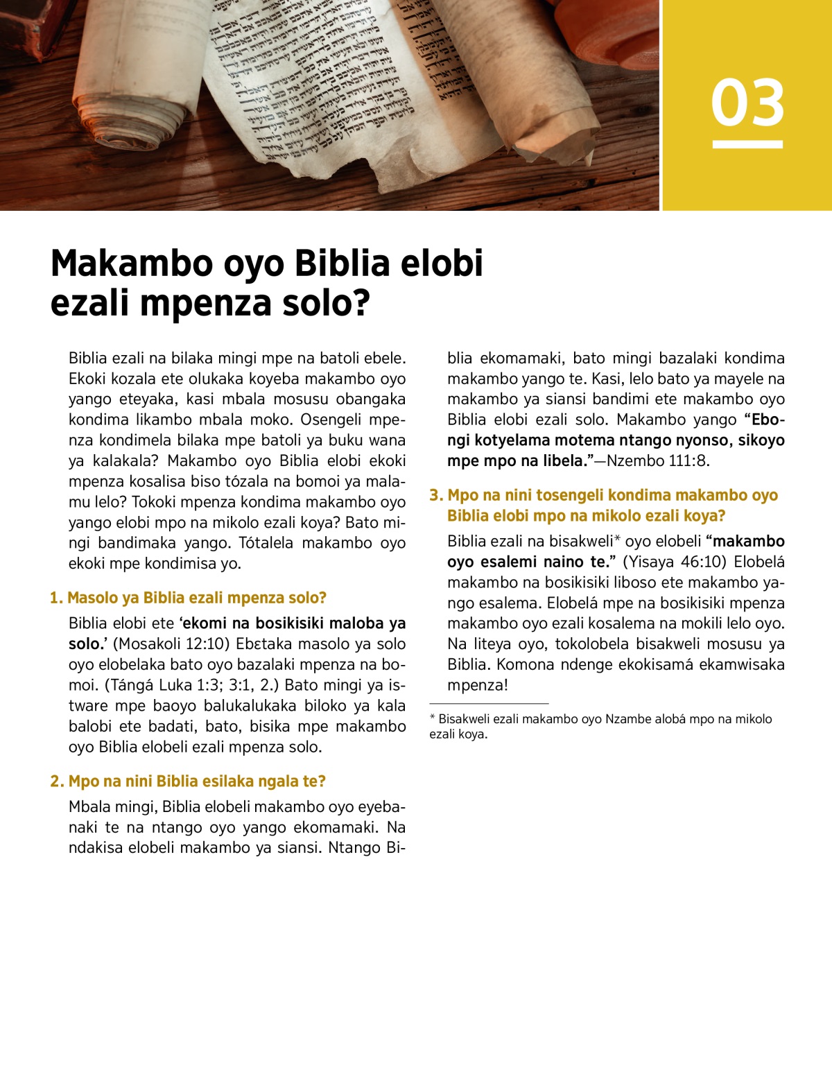 Mbala mingi, Biblia elobeli makambo oyo eyebanaki te na ntango oyo yango ekomamaki. Na ndakisa elobeli makambo ya siansi. Ntango Biblia ekomamaki, bato mingi bazalaki kondima makambo yango te. Kasi, lelo bato ya mayele na makambo ya siansi bandimi ete makambo oyo Biblia elobi ezali solo. Makambo yango “Ebongi kotyelama motema ntango nyonso, sikoyo mpe mpo na libela.” —Nzembo 111:8.