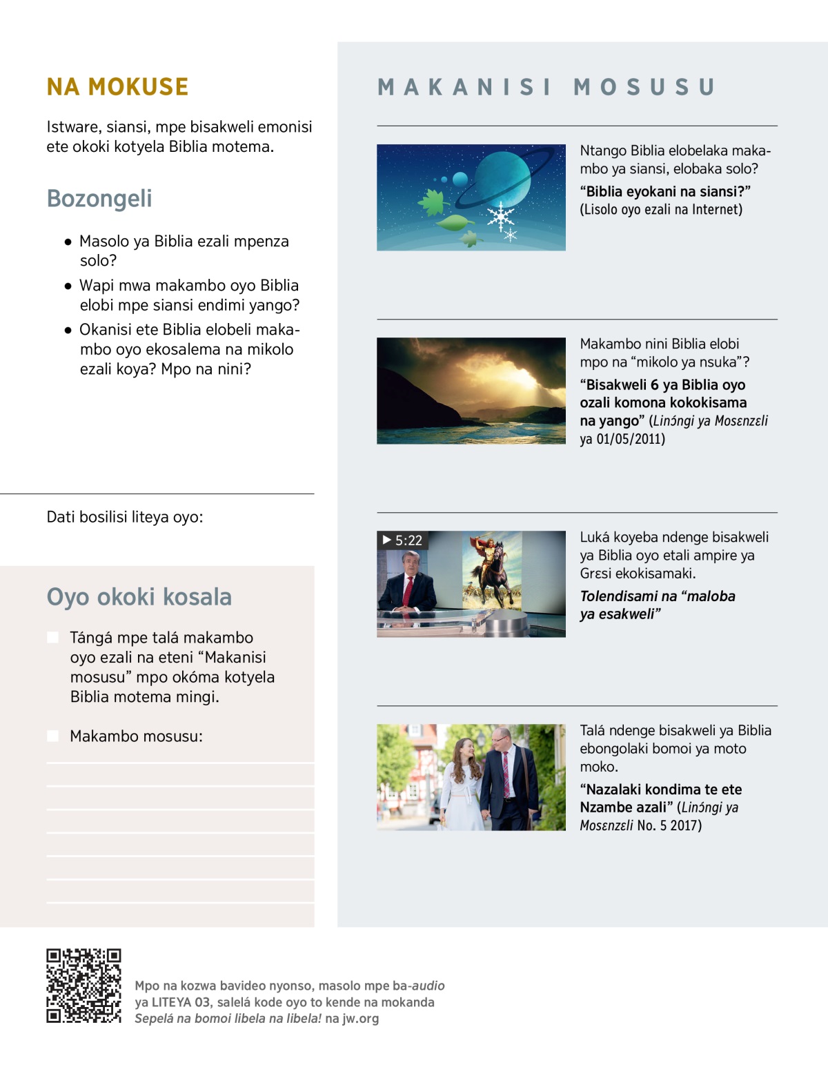Biblia ezali na bilaka mingi mpe na batoli ebele. Ekoki kozala ete olukaka koyeba makambo oyo yango eteyaka, kasi mbala mosusu obangaka kondima likambo mbala moko. Osengeli mpenza kondimela bilaka mpe batoli ya buku wana ya kalakala? Makambo oyo Biblia elobi ekoki mpenza kosalisa biso tózala na bomoi ya malamu lelo? Tokoki mpenza kondima makambo oyo yango elobi mpo na mikolo ezali koya? Bato mingi bandimaka yango. Tótalela makambo oyo ekoki mpe kondimisa yo.