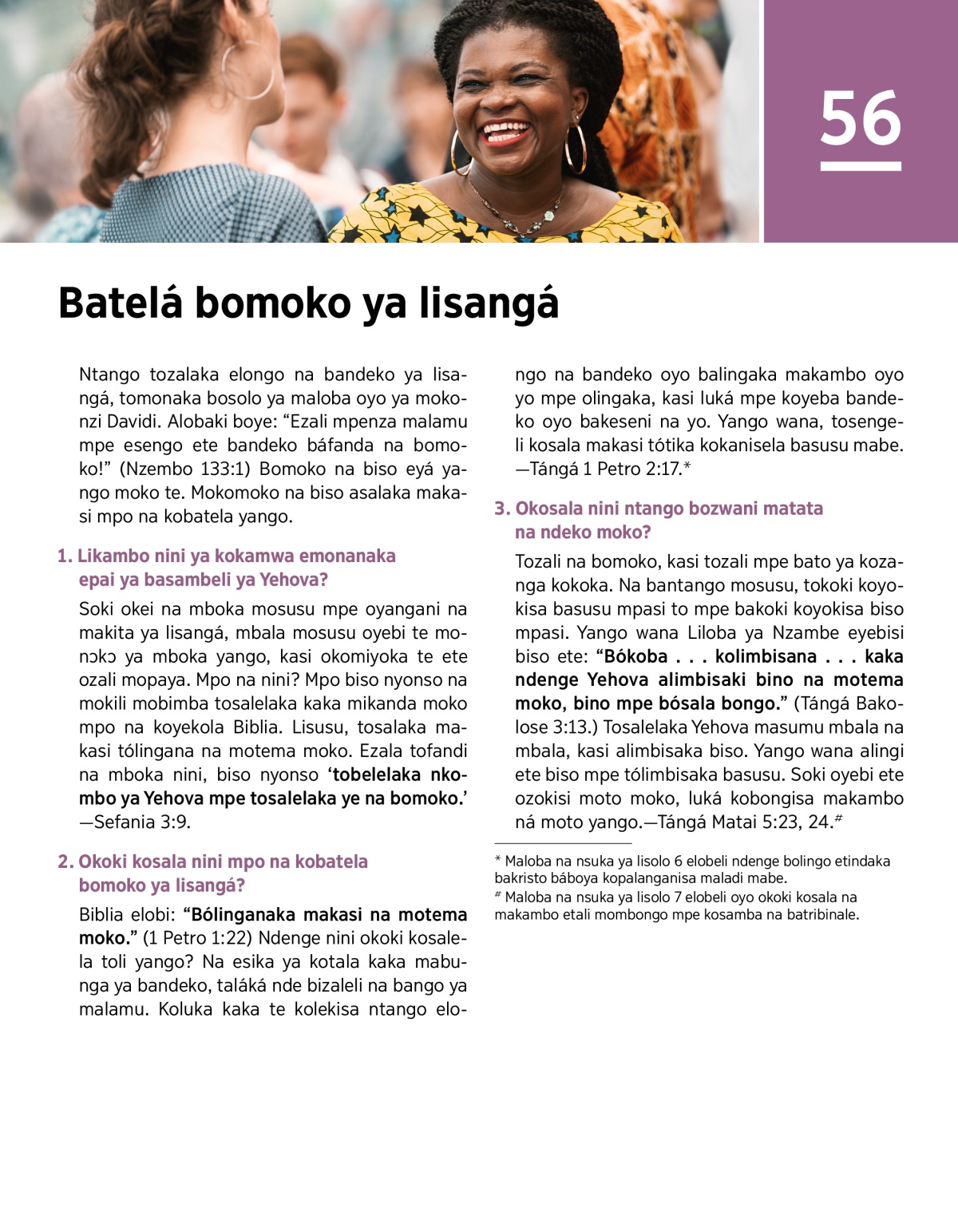Ntango tozalaka elongo na bandeko ya lisangá, tomonaka bosolo ya maloba oyo ya mokonzi Davidi. Alobaki boye: “Ezali mpenza malamu mpe esengo ete bandeko báfanda na bomoko!” (Nzembo 133:1) Bomoko na biso eyá yango moko te. Mokomoko na biso asalaka makasi mpo na kobatela yango.