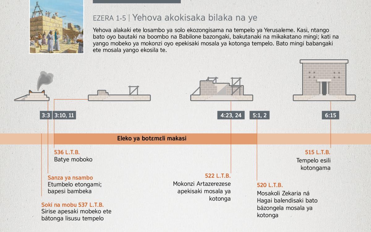 Yehova alakaki ete losambo ya solo ekozongisama na tempelo ya Yerusaleme. Kasi, ntango bato oyo bautaki na boombo na Babilone bazongaki, bakutanaki na mikakatano mingi; kati na yango mobeko ya mokonzi oyo epekisaki mosala ya kotonga tempelo. Bato mingi babangaki ete mosala yango ekosila te.