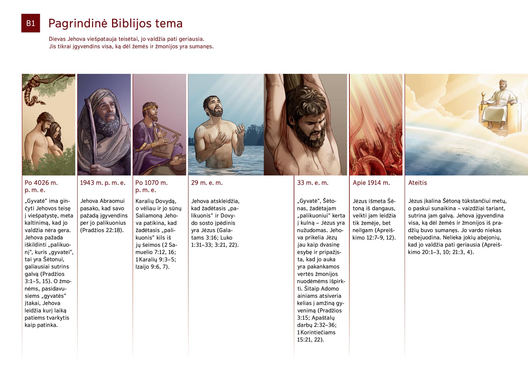 Po 4026 m. p. m. e. „Gyvatė“ ima ginčyti Jehovos teisę į viešpatystę, meta kaltinimą, kad jo valdžia nėra gera. Jehova pažada iškildinti „palikuonį“, kuris „gyvatei“, tai yra Šėtonui, galiausiai sutrins galvą (Pradžios 3:1–5, 15). O žmonėms, pasidavusiems „gyvatės“ įtakai, Jehova leidžia kurį laiką patiems tvarkytis kaip patinka. |