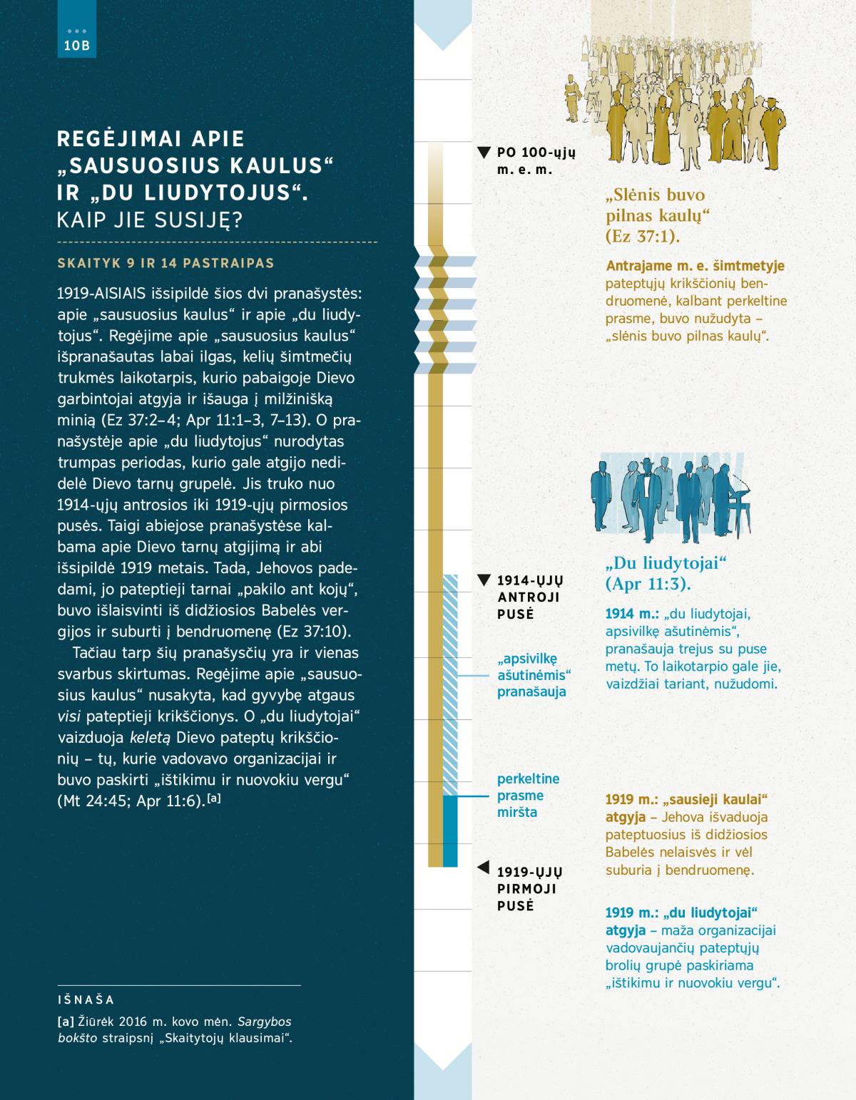 1919-AISIAIS išsipildė šios dvi pranašystės: apie „sausuosius kaulus“ ir apie „du liudytojus“. Regėjime apie „sausuosius kaulus“ išpranašautas labai ilgas, kelių šimtmečių trukmės laikotarpis, kurio pabaigoje Dievo garbintojai atgyja ir išauga į milžinišką minią (Ez 37:2–4; Apr 11:1–3, 7–13). O pranašystėje apie „du liudytojus“ nurodytas trumpas periodas, kurio gale atgijo nedidelė Dievo tarnų grupelė. Jis truko nuo 1914-ųjų antrosios iki 1919-ųjų pirmosios pusės. Taigi abiejose pranašystėse kalbama apie Dievo tarnų atgijimą ir abi išsipildė 1919 metais. Tada, Jehovos padedami, jo pateptieji tarnai „pakilo ant kojų“, buvo išlaisvinti iš didžiosios Babelės vergijos ir suburti į bendruomenę (Ez 37:10).