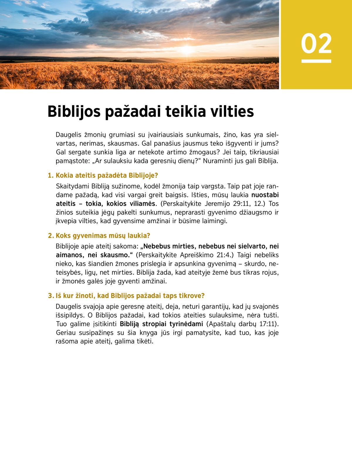 Biblijoje užrašyta daug viltingų, ateitį nušviečiančių pažadų. Jais tikėdami neprarandame gyvenimo džiaugsmo, lengviau pakeliame įvairius sunkumus.