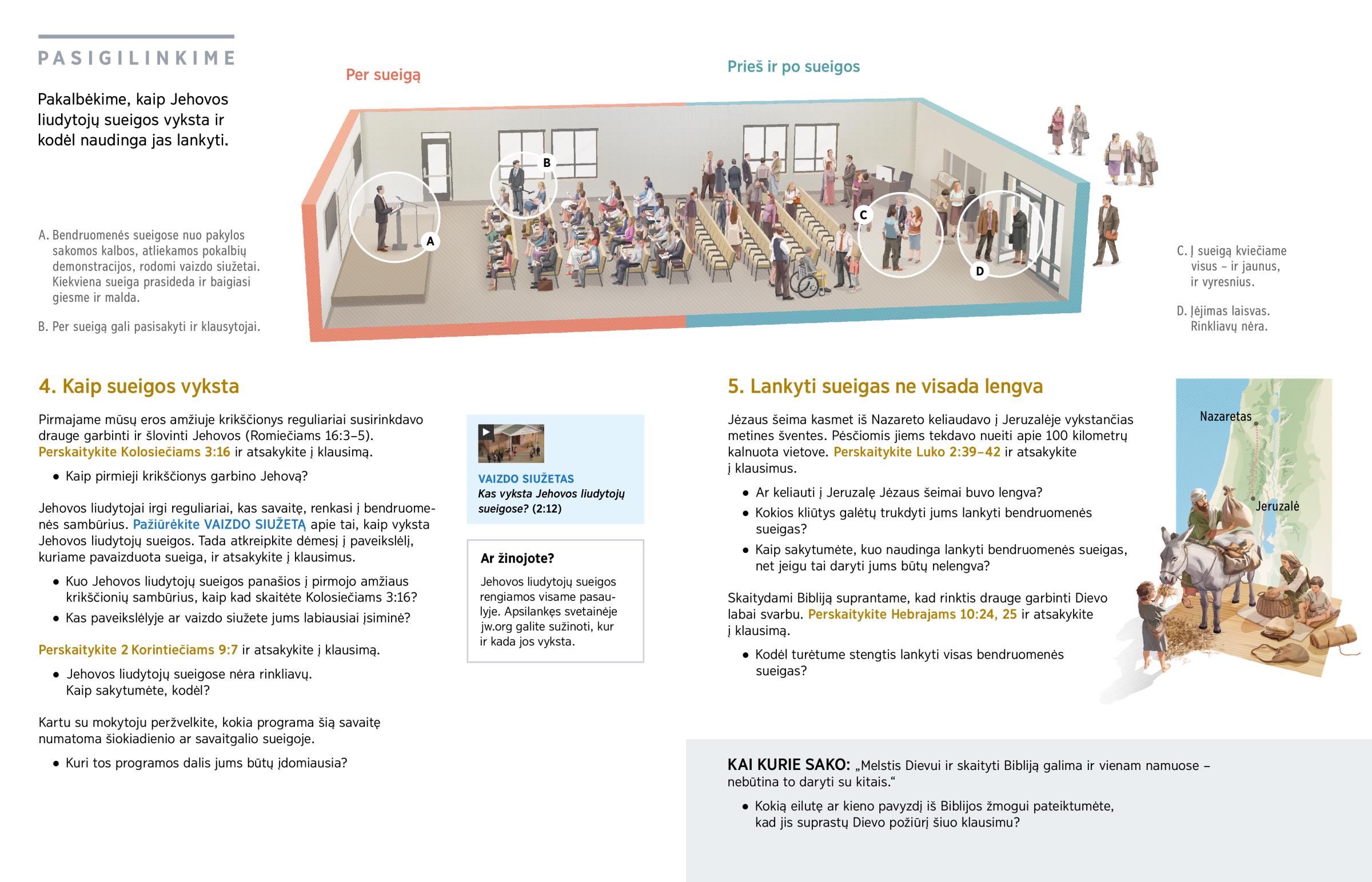 Ar kas nors jus kvietė į Jehovos liudytojų sueigą? Pirmą kartą ten nueiti gali būti nedrąsu. Gal svarstote, kas tose sueigose vyksta ir ar verta ten eiti. Šioje pamokoje pakalbėsime apie sueigų lankymo svarbą ir naudą.