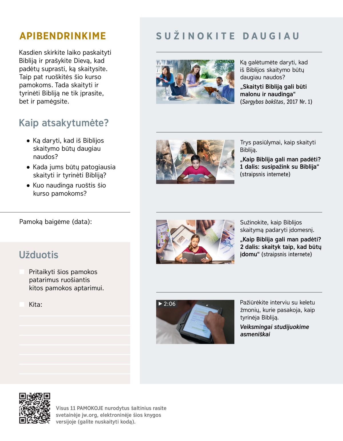 Kasdien skirkite laiko paskaityti Bibliją ir prašykite Dievą, kad padėtų suprasti, ką skaitysite. Taip pat ruoškitės šio kurso pamokoms. Tada skaityti ir tyrinėti Bibliją ne tik įprasite, bet ir pamėgsite.