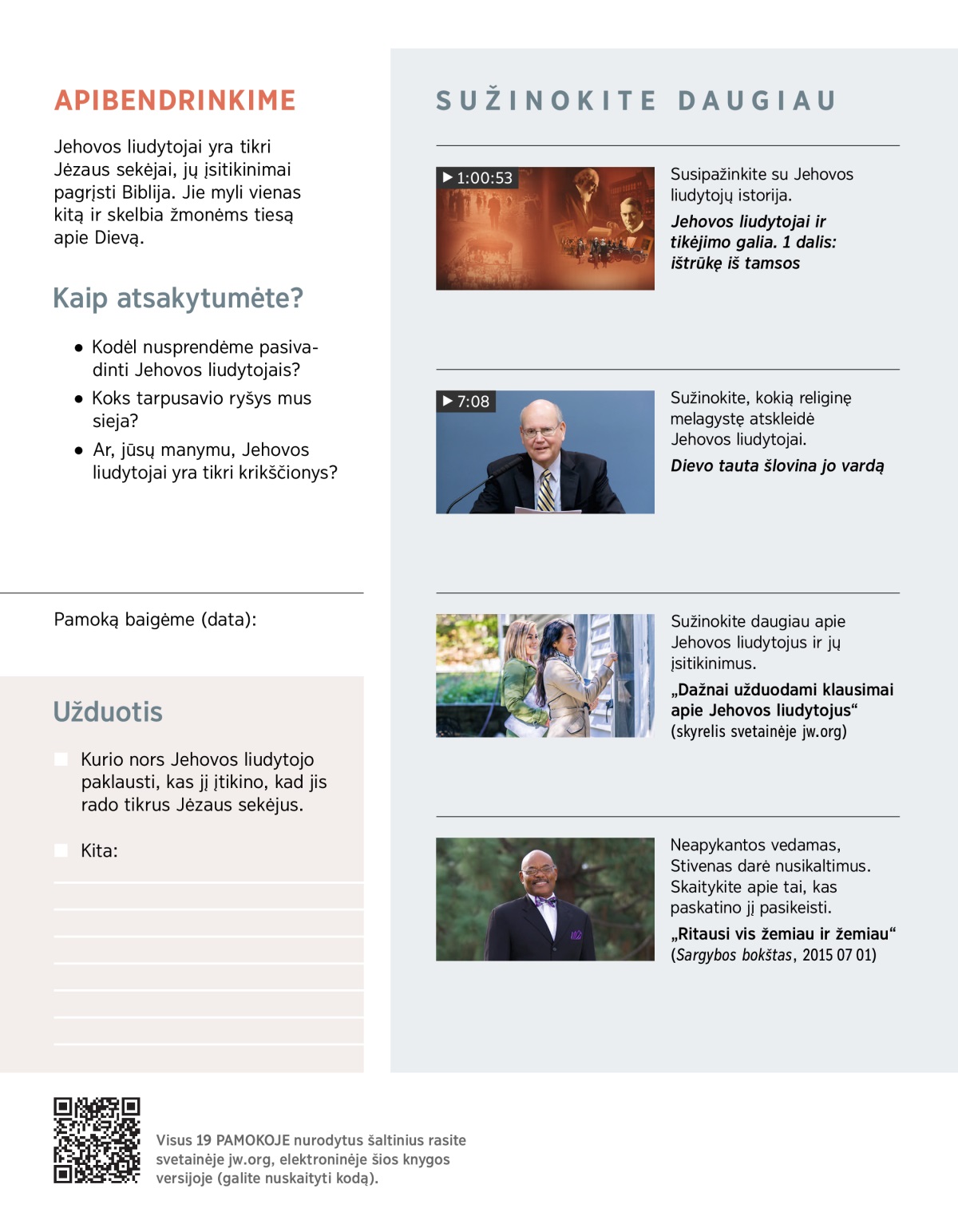 Jehovos liudytojai laiko save tikrais krikščionimis. Ar jie iš tiesų tokie yra? Šioje pamokoje aptarsime, kuo pagrįsti jų įsitikinimai, kodėl jie pasivadino Jehovos liudytojais ir iš ko matyti, kad jie vienas kitą myli.