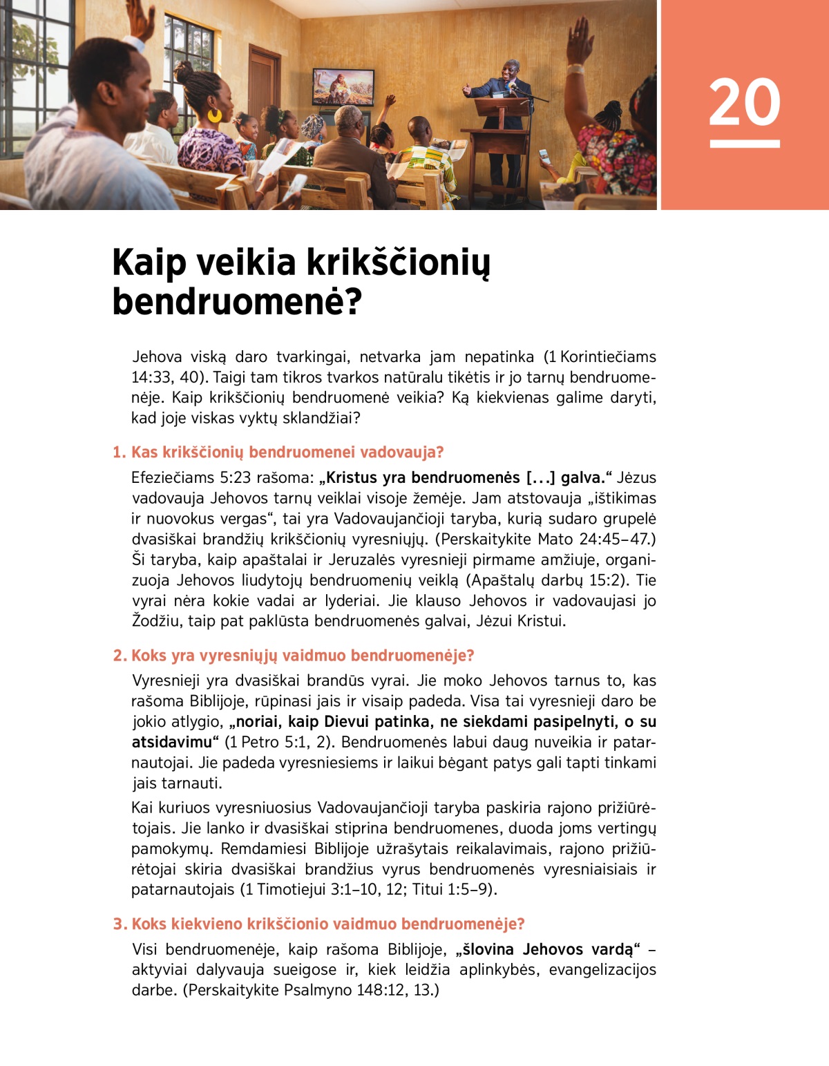 Jehova viską daro tvarkingai, netvarka jam nepatinka (1 Korintiečiams 14:33, 40). Taigi tam tikros tvarkos natūralu tikėtis ir jo tarnų bendruomenėje. Kaip krikščionių bendruomenė veikia? Ką kiekvienas galime daryti, kad joje viskas vyktų sklandžiai?