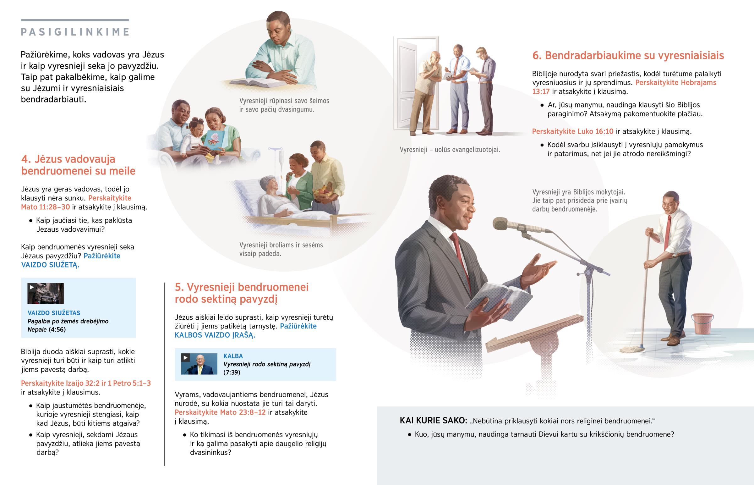 Pažiūrėkime, koks vadovas yra Jėzus ir kaip vyresnieji seka jo pavyzdžiu. Taip pat pakalbėkime, kaip galime su Jėzumi ir vyresniaisiais bendradarbiauti.