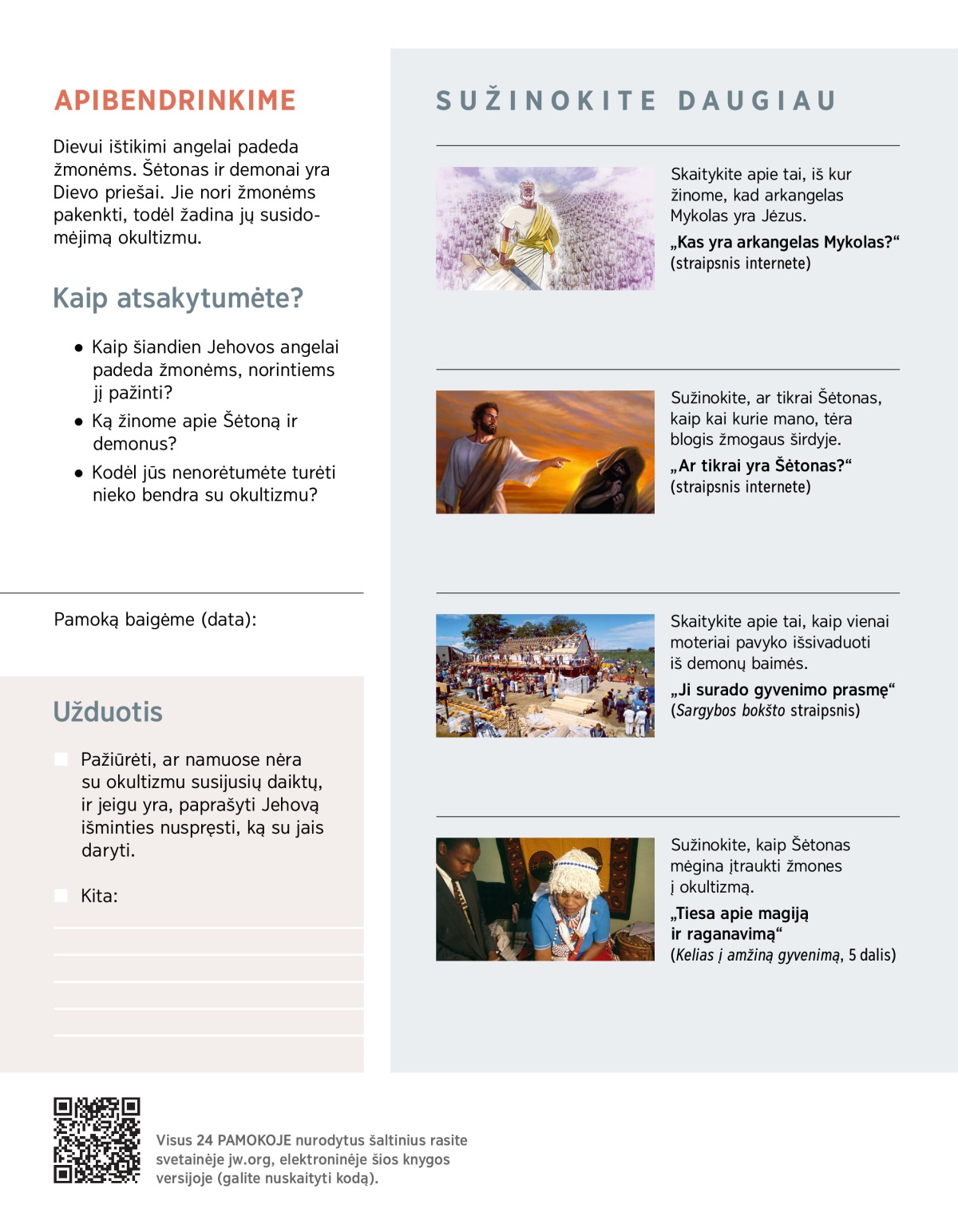 Demonų valdovas yra Šėtonas. O Dievui ištikimiems angelams vadovauja arkangelas Mykolas, tai yra Jėzus. Kokią galią jis turi? Perskaitykite Apreiškimo 12:7–9 ir atsakykite į klausimus.